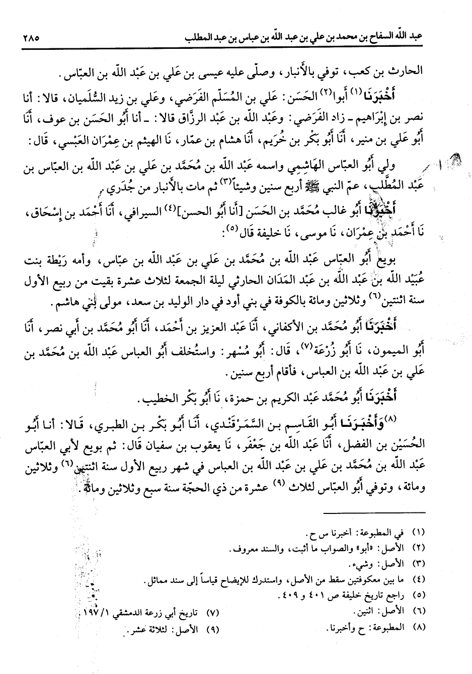 الحارث بن كعب توفي بالأنبار وصلى عليه عيسى بن علي بن عبد الله بن العباس أخبرنا (1) أبو الحسن (2) علي بن المسلم الفرضي وعلي بن زيد السلميان قالا أنا نصر بن إبراهيم زاد الفرضي وعبد الله بن عبد الرزاق قالا أنا أبو الحسن بن عوف أنا أبو علي بن منير أنا أبو بكر بن خريم أنا هشام بن عمار نا الهيثم بن عمران العبسي قال ولي أبو العباس الهاشمي واسمه عبد الله بن محمد بن علي بن عبد الله بن العباس بن عبد المطلب عم النبي (صلى الله عليه وسلم) أربع سنين وشيئا (3) ثم مات بالأنبار من جدري أخبرنا أبو غالب محمد بن الحسن أنا أبو الحسن (4) السيرافي أنا احمد بن إسحاق نا احمد بن عمران نا موسى نا خليفة قال (5) بويع العباس عبد الله بن محمد بن علي بن عبد الله بن عباس وأمه ريطة بنت عبيد الله بن عبد الله بن عبد المدان الحارثي ليلة الجمعة لثلاث عشرة بقيت من ربيع الأول سنة اثنتين (6) وثلاثين ومائة بالكوفة في بني اود في دار الوليد بن سعد مولى بني هاشم أخبرنا أبو محمد الأكفاني أنا عبد العزيز بن احمد أنا أبو محمد بن أبي نصر أنا أبو الميمون نا أبو زرعة (7) قال أبو مسهر واستخلف أبو العباس عبد الله بن محمد بن علي بن عبد الله بن العباس فأقام أربع سنين أخبرنا أبو محمد عبد الكريم بن حمزة نا أبو بكر الخطيب (8) وأخبرنا أبو القاسم بن السمرقندي أنا أبو بكر بن الطبري قالا أنا أبو الحسين بن الفضل أنا عبد الله بن جعفر نا يعقوب بن سفيان قال ثم بويع لأبي العباس عبد الله بن محمد بن علي بن عبد الله بن العباس في شهر ربيع الأول سنة اثنتين وثلاثين ومائة وتوفي أبو العباس لثلاث (9) عشرة من ذي الحجة سنة سبع وثلاثين ومائة