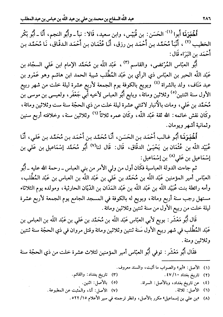 أخبرنا أبوا (1) الحسن بن قبيس وابن سعيد قالا نبأ وأبو النجم أنا أبو بكر الخطيب (2) أنبأ محمد بن احمد بن رزق أنا عثمان بن احمد الدقاق نا محمد بن احمد بن البراء قال أبو العباس المرتضى والقاسم (3) عبد الله بن محمد الإمام ابن علي السجاد بن عبد الله الحبر بن العباس ذي الرأي بن عبد المطلب شيبة الحمد ابن هاشم وهو عمرو بن عبد مناف ولد بالشراة (4) وبويع بالكوفة يوم الجمعة لاربع عشرة ليلة خلت من شهر ربيع الأول سنة اثنتين (5) وثلاثين ومائة وبايع أبو العباس لاخيه أبي جعفر ولعيسى بن موسى بن محمد بن علي ومات بالأنبار لاثنتي عشرة ليلة خلت من ذي الحجة سنة ست وثلاثين ومائة وكان نقش خاتمه الله ثقة عبد الله وكان عمره ثلاثا (6) وثلاثين سنة وخلافته أربع سنين وثمانية اشهر ويومان أخبرنا أبو غالب احمد بن الحسن أنا محمد بن احمد بن محمد بن علي أنا عبيد الله بن عثمان بن يحيى الدقاق قال لنا (7) أبو محمد إسماعيل بن علي بن إسماعيل بن علي (8) بن إسماعيل ثم جاءت الدولة العباسية فكان أول من ولي الأمر من بني العباس رحمه الله عليه أبو العباس أمير المؤمنين عبد الله بن محمد بن علي بن عبد الله بن العباس بن عبد المطلب وأمه رائطة بنت عبيد الله بن عبد الله بن عبد المدان بن الديان الحارثية ومولده يوم الثلاثاء مستهل رجب سنة أربع ومائة وبويع له بالكوفة في المسجد الجامع يوم الجمعة لاربع عشرة ليلة خلت من ربيع الأول من سنة ثنتين وثلاثين ومائة قال أبو معشر بويع لأبي العباس عبد الله بن محمد بن علي بن عبد الله بن العباس بن عبد المطلب في شهر ربيع الأول سنة ثنتين وثلاثين ومائة وقتل مروان في ذي الحجة سنة ثنتين وثلاثين ومئة فقال أبو معشر توفي أبو العباس أمير المؤمنين لثلاث عشرة خلت من ذي الحجة سنة ست وثلاثين ومائة فكانت خلافته أربع نين وعشرة اشهر