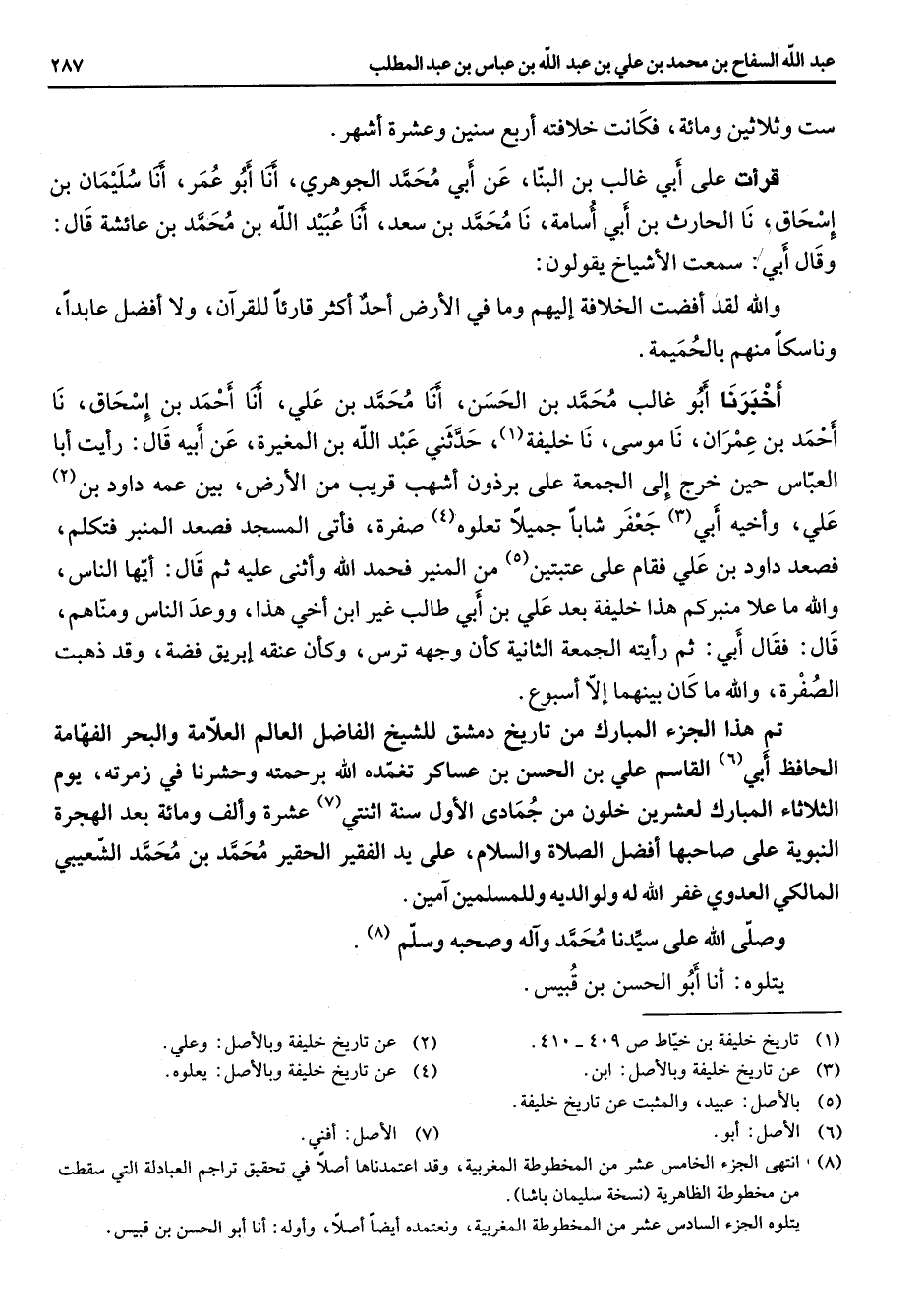 قرأت على أبي غالب بن البنا عن أبي محمد الجوهري أنا أبو عمر أنا سليمان بن إسحاق نا الحارث بن أبي أسامة نا محمد بن سعد أنا عبيد الله بن محمد بن عائشة قال وقال أبي سمعت الاشياخ يقولون والله لقد قضيت الخلافة إليهم وما في الأرض أحد اكثر قارئا للقران ولا افضل عابدا وناسكا منهم بالحميمة أخبرنا أبو غالب محمد بن الحسن أنا محمد بن علي أنا احمد بن إسحاق نا احمد بن عمران نا موسى نا خليفة (1) حدثني عبد الله بن المغيرة عن أبيه قال رأيت أبا العباس حين خرج إلى الجمعة على برذون اشهب قريب من الأرض بين عمه داود بن (2) علي واخيه أبي (3) جعفر شابا جميلا تعلوه (4) صفرة فأتى المسجد فصعد المنبر فتكلم فصعد داود بن علي فقام على عتبتين (5) من المنير فحمد الله واثنى عليه ثم قال أيها الناس والله ما علا منبركم هذا خليفة بعد علي بن أبي طالب غير ابن أخي هذا ووعد الناس ومناهم قال فقال أبي ثم رايته الجمعة الثانية كأن وجهه ترس وكأن عنقه ابريق فضة وقد ذهبت الصفرة والله ما كان بينهما إلا اسبوع تم هذا الجزء المبارك من تاريخ دمشق للشيخ الفاضل العالم العلامة والبحر الفهامة الحافظ أبي (6) القاسم علي بن الحسن بن عساكر تغمده الله برحمته وحشرنا في زمرته يوم الثلاثاء المبارك لعشرين خلون من جمادى الأول سنة اثنتي (7) عشرة والف ومائة بعد الهجرة النبوية على صاحبها افضل الصلاة والسلام على يد الفقير الحقير محمد بن محمد الشعبي المالكي العدوي غفر الله له ولوالديه وللمسلمين امين وصلى الله على سيدنا محمد واله وصحبة وسلم (8) يتلوه أنا أبو الحسن بن قبيس