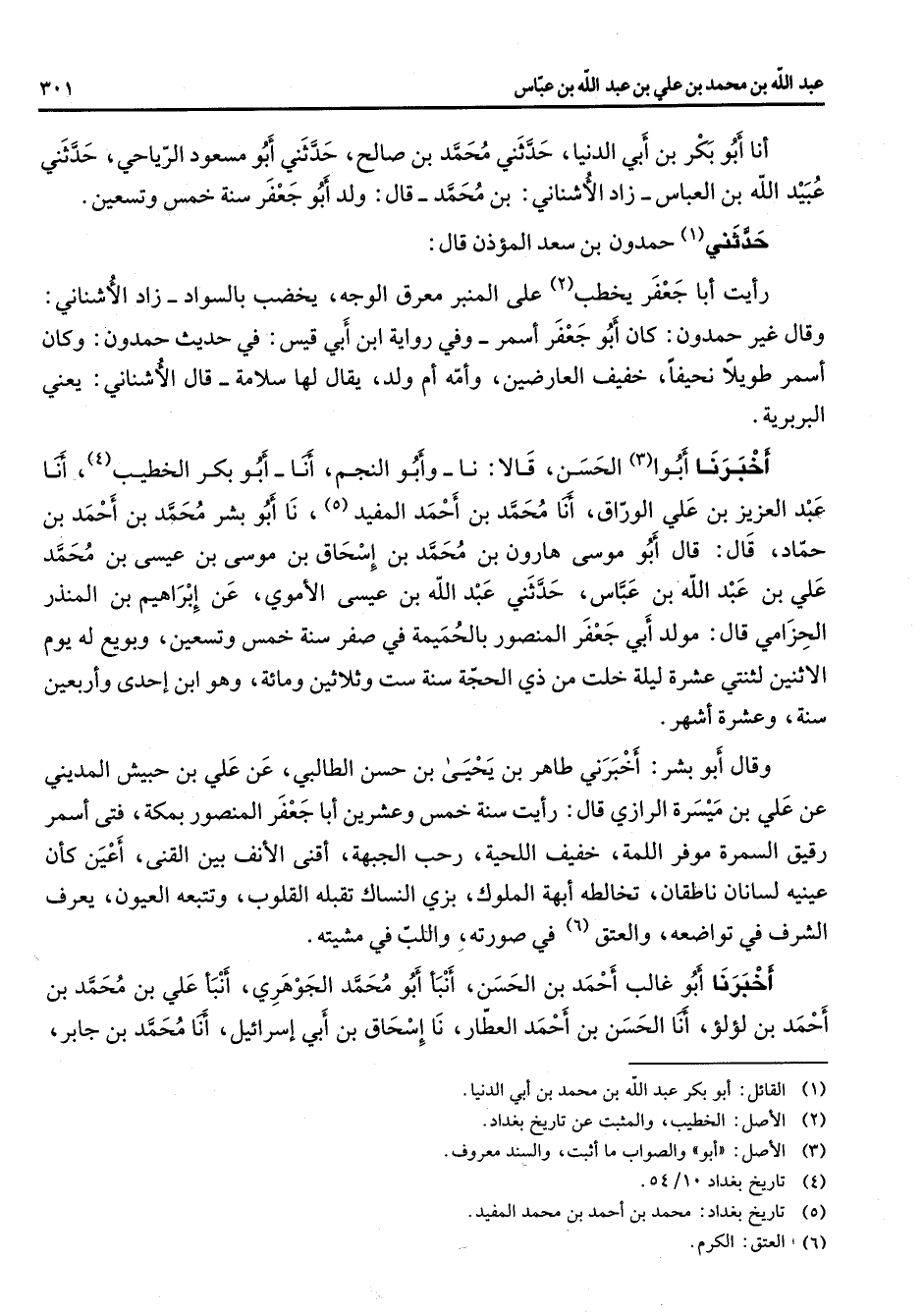 أنا أبو بكر بن أبي الدنيا حدثني محمد بن صالح حدثني أبو مسعود الرياحي حدثني عبيد الله بن العباس زاد الاشناني بن محمد قال ولد أبو جعفر سنة خمس وتسعين حدثني (1) حمدون بن سعد المؤذن قال رأيت أبا جعفر يخطب (2) على المنبر معرق الوجه يخضب بالسواد زاد الاشناني وقال غير حمدون كان أبو جعفر اسمر وفي رواية ابن أبي قيس في حديث حمدون وكان اسمر طويلا نحيفا خفيف العارضين وأمه أم ولد يقال لها سلامة قال الاشناني يعني البربرية أخبرنا أبوا (3) الحسن قالا نا وأبو النجم أنا أبو بكر الخطيب (4) أنا عبد العزيز بن علي الوراق أنا محمد بن احمد المفيد (5) نا أبو بشر محمد بن احمد بن حماد قال قال أبو موسى هارون بن محمد بن إسحاق بن موسى بن عيسى بن محمد علي بن عبد الله بن عباس حدثني عبد الله بن عيسى الأموي عن إبراهيم بن المنذر الحزامي قال مولد أبي جعفر المنصور بالحميمة في صفر سنة خمس وتسعين بويع له يوم الاثنين لثنتي عشرة ليلة خلت من ذي الحجة سنة ستة وثلاثين ومائة وهو ابن إحدى واربعين سنة وعشرة اشهر وقال أبو بشر اخبرني طاهر بن يحيى بن حسن الطالبي عن علي بن حبيش المديني عن علي بن ميسرة الرازي قال رأيت سنة خمس وعشرين أبا جعفر المنصور بمكة فتى اسمر رقيق السمرة موفر اللمة خفيف اللحية رجب الجبهة اقنى الانف بين القنى اعين كأن عينيه لسانان ناطقان تخالطه ابهة الملوك بزي النساك تقبله القلوب وتتبعه العيون يعرف الشرف في تواضعه والعتق (6) في صورته واللب في مشيته أخبرنا أبو غالب احمد بن الحسن أنبأ أبو محمد الجوهري أنبأ علي بن محمد بن احمد بن لؤلؤ أنا الحسن بن احمد العطار نا إسحاق بن أبي إسرائيل أنا محمد بن جابر
