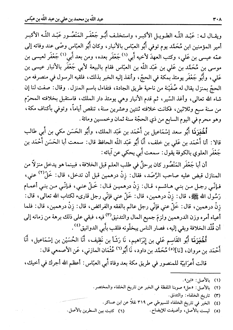 ويقال له عبد الله الطويل الأكبر واستخلف أبو جعفر المنصور بن عبد الله الأكبر أمير المؤمنين ابن محمد يوم توفي أبو العباس بالأنبار وكان أبو العباس وصى عند وفاته إلى عمه عيسى بن علي وكتب العهد لاخيه أبي (1) جعفر بعده ومن بعد أبي (1) جعفر لعيسى بن موسى بن محمد بن علي بن عبد الله بن العباس فقام بالبيعة لأبي جعفر بالأنبار عيسى بن علي وأبو جعفر يومئذ بمكة في الحج وأنفذ إليه الخبر بذلك فلقيه الرسول في منصرفه من الحج بمنزل يقال له صفينة من ناحية طريق الجادة فتفاءل باسم المنزل وقال صفت لنا أن شاء الله تعالى واغذ السير ثم قدم الانبار وهي يومئذ دار الملك فاستقبل بخلافته المحرم من سنة سبع وثلاثين فكانت خلافته ثنتين وعشرين سنة تنقص أياما وتوفي بأكناف مكة وهو محرم في اليوم السابع من ذي الحجة سنة ثمان وخمسين ومائة أخبرنا أبو سعد إسماعيل بن احمد بن عبد الملك وأبو الحسن مكي بن أبي طالب قالا أنا احمد بن علي بن خلف انا أبو عبد الله الحافظ قال سمعت أبا الحسن احمد بن جعفر العلوي بالكوفة يقول سمعت أبي يحكي عن ابائه أن أبا جعفر المنصور كان يرحل في طلب العلم قبل الخلافة فبينما هو يدخل منزلا من المنازل قبض عليه صاحب الرصد فقال زن درهمين قبل أن تدخل قال خل (2) عني فاني رجل من بني هاشم قال زن درهمين قال خل عني فاني من بني اعمام رسول الله (صلى الله عليه وسلم) قال زن درهمين قال خل عني فاني رجل قارئ لكتاب الله تعالى قال زن درهمين قال خل عني فإني رجل عالم بالفقه والفرائض قال زن درهمين قال فلما اعياه أمره وزن الدرهمين ولزم جميع المال والتدنيق (3) فيه فبقي على ذلك برهة من زمانه إلى أن قلد الخلافة وبقي إليه فصار الناس يبخلونه فلقب بأبي الدوانيق (4) أخبرنا أبو القاسم علي بن إبراهيم نا رشأ بن نظيف أنا الحسين بن إسماعيل أنا احمد بن مروان نا (5) محمد بن داود نا أبو (6) عثمان المازني عن الأصمعي قال قالت اعرابية للمنصور في طريق مكة بعد وفاة أبي العباس اعظم الله اجرك في اخيك