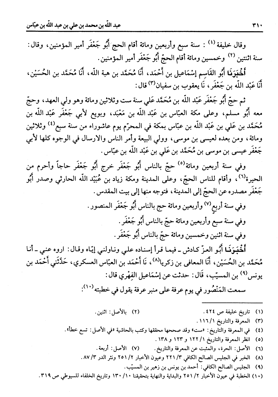 وقال خليفة (1) سنة سبع وأربعين ومائة أقام الحج أبو جعفر أمير المؤمنين وقال سنة اثنتين (2) وخمسين ومائة أقام الحج أبو جعفر أمير المؤمنين أخبرنا أبو القاسم إسماعيل بن بن أحمد أنا محمد بن هبة الله أنا محمد بن الحسين أنا عبد الله بن جعفر نا يعقوب بن سفيان (3) قال ثم حج أبو جعفر عبد الله بن محمد علي سنة ست وثلاثين ومائة وهو ولي العهد وحج معه أبو مسلم وعلى مكة العباس بن عبد الله بن معبد وبويع لأبي جعفر عبد الله بن محمد بن علي بن عبد الله بن عباس بمكة في المحرم يوم عاشوراء من سنة سبع (4) وثلاثين ومائة ومن بعده لعيسى بن موسى وولي البيعة وأمر الناس والارسال في الوجوه كلها لأبي جعفر عيسى بن موسى بن محمد بن علي بن عبد الله بن عباس وفي سنة أربعين ومائة (5) حج بالناس أبو جعفر خرج أبو جعفر حاجا وأحرم من الحيرة (6) وأقام للناس الحج وعلى المدينة ومكة زياد بن عبيد الله الحارثي وصدر أبو جعفر مصدره عن الحج إلى المدينة فتوجه منها إلى بيت المقدس وفي سنة أربع (7) وأربعين ومائة حج بالناس أبو جعفر المنصور وفي سنة سبع وأربعين ومائة حج بالناس أبو جعفر وفي سنة اثنين وخمسين ومائة حج بالناس أبو جعفر أخبرنا أبو العز كادش فيما قرأ إسناده علي وناولني إياه وقال اروه عني أنا محمد بن الحسين أنا المعافى بن زكريا (8) نا أحمد بن العباس العسكري حدثني أحمد بن يونس (9) بن المسيب قال حدثت عن إسماعيل الفهري قال سمعت المنصور في يوم عرفة على منبر عرفة يقول في خطبته (10)