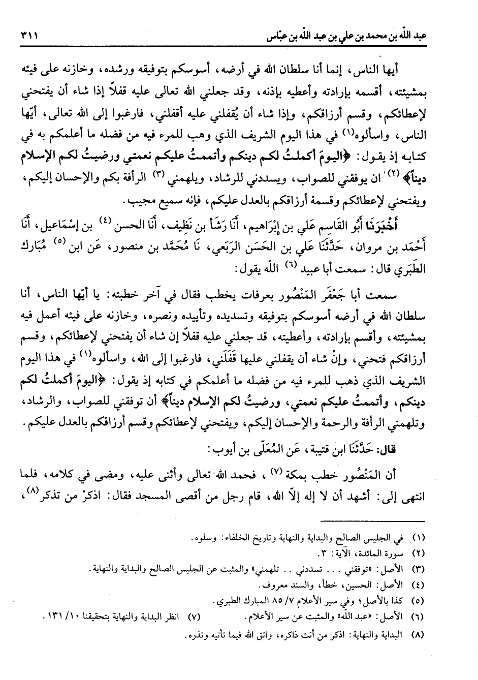 أيها الناس إنما أنا سلطان الله في أرضه أسوسكم بتوفيقه ورشده وخازنه على فيئه بمشيئته أقسمه بإرادته وأعطيه بإذنه وقد جعلني الله تعالى عليه قفلا إذا شاء أن يفتحني لإعطائكم وقسم أرزاقكم وإذا شاء أن يقفلني عليه أقفلني فارغبوا إلى الله تعالى أيها الناس وأسألوه (1) في هذا اليوم الشريف الذي وهب للمرء فيه من فضله ما أعلمكم به في كتابه إذ يقول " اليوم أكملت لكم دينكم وأتتمت عليكم نعمتي ورضيت لكم الإسلام دينا " (2) إن يوفقني للصواب ويسددني للرشاد ويلهمني (3) الرأفة بكم والإحسان إليكم ويفتحني لإعطائكم وقسمة أرزاقكم بالعدل عليكم فإنه سميع مجيب أخبرنا أبو القاسم علي بن إبراهيم أنا رشأ بن نظيف أنا الحسن (4) بن إسماعيل أنا أحمد بن مروان حدثنا علي بن الحسن الربعي نا محمد بن منصور عن ابن (5) مبارك الطبري قال سمعت أبا عبيد (6) الله يقول سمعت أبا جعفر المنصور بعرفات يخطب فقال في آخر خطبته يا أيها الناس أنا سلطان الله في أرضه أسوسوكم بتوفيقه وتسديده وتأييده ونصره وخازنه على فيئه أعمل فيه بمشيئته وأقسم بإرادته وأعطيته قد جعلني عليه قفلا إن شاء أن يفتحني لإعطائكم وقسم أرزاقكم فتحني وإن شاء أن يقفلني عليها قفلني فارغبوا إلى الله واسألوه (1) في هذا اليوم الشريف الذي ذهب للمرء فيه من فضله ما أعلمكم في كتابه إذ يقول " اليوم أكملت لكم دينك وأتتمت عليكم نعمتي ورضيت لكم الإسلام دينا " أن توفقني للصواب والرشاد وتلهمني الرأفة والرحمة الإحسان إليكم ويفتحني لإعطائكم وقسم أرزاقكم بالعدل عليكم قال حدثنا ابن قتيبة عن المعلى بن أيوب أن المنصور خطب بمكة (7) فحمد الله تعالى وأثنى عليه ومضى في كلامه فلما انتهى إلى أشهد أن لا إله إلا الله قام رجل من أقصى المسجد فقال ادكر من تذكر (8)