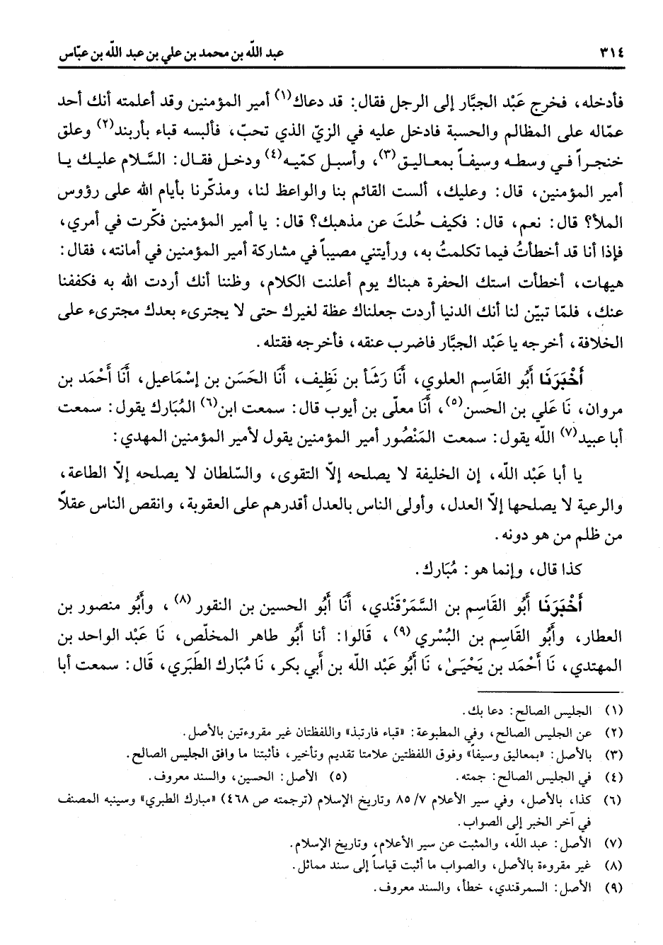 فأدخله فخرج عبد الجبار إلى الرجل فقال قد دعاك أمير المؤمنين وقد اعلمته انك أحد عماله على المظالم والحسبة فادخل عليه في الزي الذي تحب فألبسه قباء بأربند (2) علق خنجرا في وسطه وسيفا بمعاليق (3) واسبل كميه (4) ودخل فقال السلام عليك يا أمير المؤمنين قال وعليك الست القائم بنا والواعظ لنا ومذكرنا بأيام الله على رؤوس الملأ قال نعم قال فكيف حلت عن مذهبك قال يا أمير المؤمنين فكرت في امري فإذا أنا قد اخطأت فيما تكلمت به ورأيتني مصيبا في مشاركة أمير المؤمنين في امانته فقال هيهات اخطأت استك الحفرة هنباك يوم اعلنت الكلام وظننا انك اردت الله به فكففنا عنك فلما تبين لنا انك الدنيا اردت جعلناك عظة لغيرك حتى لا يجترئ بعدك مجترئ على الخلافة اخرجه يا عبد الجبار فاضرب عنقه فأخرجه فقتله أخبرنا أبو القاسم العلوي أنا رشأ بن نظيف أنا الحسن بن إسماعيل أنا احمد بن مروان نا علي بن الحسن (5) أنا معلى بن أيوب قال سمعت ابن (6) المبارك يقول سمعت أبا عبيد (7) الله يقول سمعت المنصور أمير المؤمنين يقول لأمير المؤمنين المهدي يا أبا عبد الله أن الخليفة لا يصلحه إلا التقوى والسلطان لا يصلحه إلا الطاعة والرعية لا يصلحها إلا العدل واولى الناس بالعدل اقدرهم على العقوبة وانقص الناس عقلا من ظلم من هو دونه كذا قال وإنما هو مبارك أخبرنا أبو القاسم بن السمرقندي أنا أبو الحسين بن النقور (8) وأبو منصور بن العطار وأبو القاسم بن البسري (9) قالوا أنا أبو طاهر المخلص نا عبد الواحد بن المهتدي نا احمد بن يحيى نا أبو عبد الله بن أبي بكر نا مبارك الطبري قال سمعت أبا