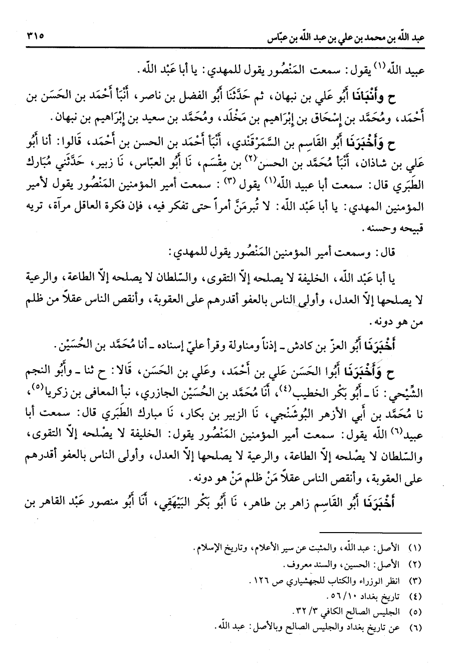 عبيد الله (1) يقول سمعت المنصور يقول للمهدي يا أبا عبد الله ح أنبأنا أبو علي بن نبهان ثم حدثنا أبو الفضل بن ناصر أنبأ احمد بن الحسن بن احمد ومحمد بن إسحاق بن إبراهيم بن مخلد ومحمد بن سعيد بن إبراهيم بن نبهان ح وأخبرنا أبو القاسم بن السمرقندي أنبأ احمد بن الحسن بن احمد قالوا أنا أبو علي بن شاذان أنبأ محمد بن الحسن (2) بن مقسم نا أبو العباس نا زبير حدثني مبارك الطبري قال سمعت أبا عبيد الله (1) يقول (3) سمعت أمير المؤمنين المنصور يقول لأمير المؤمنين المهدي يا أبا عبد الله لا تبرمن أمرا حتى تفكر فيه فان فكرة العاقل مرآة تريه قبيحه وحسنه قال وسمعت أمير المؤمنين المنصور يقول للمهدي يا أبا عبد الله الخليفة لا يصلحه إلا التقوى والسلطان لا يصلحه إلا الطاعة والرعية لا يصلحها إلا العدل واولى الناس بالعفو اقدرهم على العقوبة وانقص الناس عقلا من ظلم من هو دونه أخبرنا أبو العز بن كادش اذنا ومناولة وقرا علي إسناده أنا محمد بن الحسين ح وأخبرنا أبو الحسن علي بن احمد وعلي بن الحسن قالا ح ثنا وأبو النجم الشيحي نا أبو بكر الخطيب (4) أنا محمد بن الحسين الجازري نبأ المعافى بن زكريا (5) نا محمد بن أبي الأزهر البوشنجي نا الزبير بن بكار نا مبارك الطبري قال سمعت أبا عبيد (6) الله يقول سمعت أمير المؤمنين المنصور يقول الخليفة لا يصلحه إلا التقوى والسلطان لا يصلحه إلا الطاعة والرعية لا يصلحها إلا العدل واولى الناس بالعفو اقدرهم على العقوبة وانقص الناس عقلا من ظلم من هو دونه أخبرنا أبو القاسم زاهر بن طاهر نا أبو بكر البيهقي أنا أبو منصور عبد القاهر بن