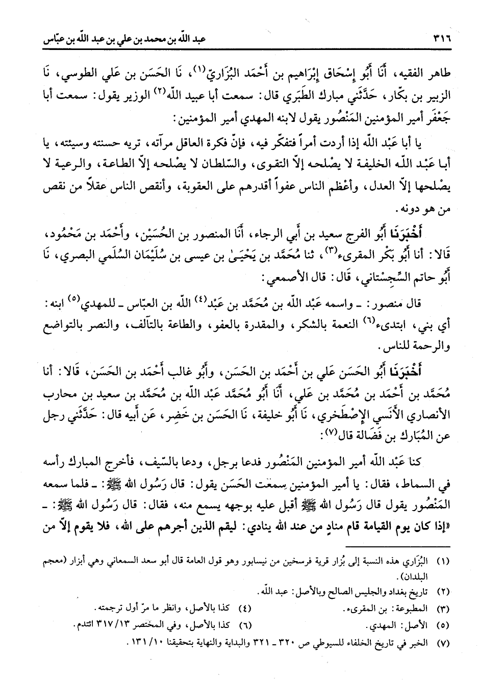 طاهر الفقيه أنا أبو إسحاق إبراهيم بن احمد البزاري (1) نا الحسن بن علي الطوسي نا الزبير بن بكار حدثني مبارك الطبري قال سمعت ابا عبيد (2) الله الوزير يقول سمعت أبا جعفر أمير المؤمنين المنصور يقول لابنه أمير المؤمنين يا أبا عبد الله إذا اردت أمرا فتفكر فيه فان فكرة العاقل مرآته تريه حسنته وسيئته يا أبا عبد الله الخليفة لا يصلحه إلا التقوى والسلطان لا يصلحه إلا الطاعة والرعية لا يصلحها إلا العدل واعظم الناس عفوا اقدرهم على العقوبة وانقص الناس عقلا من نقص من هو دونه أخبرنا أبو الفرج سعيد بن أبي الرجاء أنا المنصور بن الحسين واحمد بن محمود قالا أنا أبو بكر المقرئ (3) ثنا محمد بن يحيى بن عيسى بن سليمان السلمي البصري نا أبو حاتم السجستاني قال قال الأصمعي قال منصور واسمه عبد الله بن محمد بن عبد (4) الله العباس للمهدي (5) ابنه أي بني ابتدئ (6) النعمة بالشكر والمقدرة بالعفو والطاعة بالتألف والنصر بالتواضع والرحمة للناس أخبرنا أبو الحسن علي بن احمد بن الحسن وأبو غالب احمد بن الحسن قالا أنا محمد بن احمد بن محمد بن علي أنا أبو محمد عبد الله بن محمد بن سعيد بن محارب الأنصاري الانسي الاصطخري نا أبو خليفة نا الحسن بن خضر عن أبيه قال حدثني رجل عن المبارك بن فضالة قال (7) كنا عبد الله أمير المؤمنين المنصور فدعا برجل ودعا بالسيف فأخرج المبارك رأسه في السماط فقال يا أمير المؤمنين سمعت الحسن يقول قال رسول الله (صلى الله عليه وسلم) فلما سمعه المنصور يقول قال رسول الله (صلى الله عليه وسلم) اقبل عليه بوجهه يسمع منه فقال قال رسول الله (صلى الله عليه وسلم) إذا كان يوم القيامة قام مناد من عند الله ينادي ليقم الذين اجرهم على الله فلا يقوم إلا من