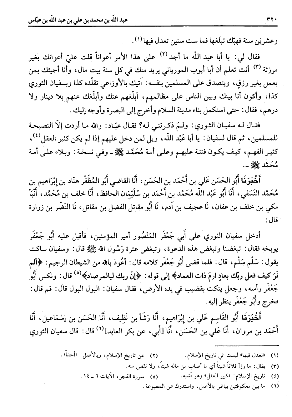 وعشرين سنة فهبك تبلغها فما ست سنين تعدل فيها (1) فقال لي يا أبا عبد الله ما اجد (2) على هذا الأمر اعوانا قلت علي اعوانك بغير مرزئة (3) أنت تعلم أن أبا أيوب المورياني يريد منك في كل سنة بيت مال وأنا اجيئك بمن يعمل بغير رزق ويتصدق على المسلمين بنفسه آتيك بالاوزاعي تقلده كذا وبسفيان الثوري كذا واكون أنا بينك وبين الناس على مظالمهم ابلغهم عنك وابلغك عنهم بلا دينار ولا درهم فقال حتى استكمل بناء مدينة السلام واخرج إلى البصرة واوجه إليك فقال له سفيان الثوري ولم ذكرتني له فقال عباد والله ما اردت إلا النصيحة للمسلمين ثم قال لسفيان يا أبا عبد الله ويل لمن دخل عليهم إذا لم يكن كثير العقل (4) كثير الفهم كيف يكون فتنة عليهم وعلى أمة محمد (صلى الله عليه وسلم) وفي نسخة وبلاء على أمة محمد (صلى الله عليه وسلم) أخبرنا أبو الحسن علي بن احمد بن الحسن أنا القاضي أبو المظفر هناد بن إبراهيم بن محمد النسفي أنا أبو عبد الله محمد بن احمد بن سليمان الحافظ أنا خلف بن محمد أنبأ مكي بن خلف بن عثمان نا عجيف بن آدم نا أبو مقاتل الفضل بن مقاتل نا النضر بن زرارة قال ادخل سفيان الثوري على أبي جعفر المنصور أمير المؤمنين فأقبل عليه أبو جعفر يوبخه فقال تبغضنا وتبغض هذه الدعوة وتبغض عنترة رسول الله (صلى الله عليه وسلم) قال وسفيان ساكت يقول سلم سلم قال فلما قضى أبو جعفر كلامه قال أعوذ بالله من الشيطان الرجيم " ألم تر كيف فعل ربك بعاد ارم ذات العماد " إلى قوله " إن ربك لبالمرصاد " (5) قال ونكس أبو جعفر رأسه وجعل ينكت بقضيب في يده الأرض فقال سفيان البول البول قال قم قال فخرج وأبو جعفر ينظر إليه أخبرنا أبو القاسم علي بن إبراهيم أنا رشأ بن نظيف أنا الحسن بن إسماعيل أنا احمد بن مروان أنا علي بن الحسن أنا أبي عن بكر العابد (6) قال قال سفيان الثوري