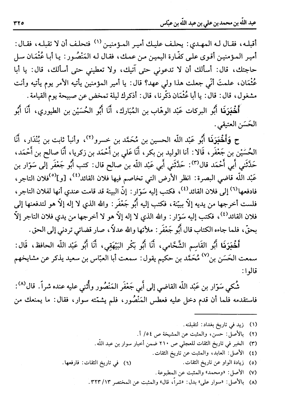 أقبله فقال له المهدي يحلف عليك أمير المؤمنين (1) فتحلف أن لا تقبله فقال أمير المؤمنين أقوى على كفارة اليمين من عمك فقال له المنصور يا أبا عثمان سل حاجتك قال أسألك أن لا تدعوني حتى آتيك ولا تعطيني حتى أسألك قال يا أبا عثمان علمت أني جعلت هذا ولي عهد قال يا أمير المؤمنين يأتيه الأمر يوم يأتيه وأنت مشغول قال قال يا أبا عثمان ذكرنا قال أذكرك ليلة تمخض عن صبيحة يوم القيامة أخبرنا أبو البركات عبد الوهاب بن المبارك أنا أبو الحسين بن الطيوري أنا أبو الحسن العتيقي ح وأخبرنا أبو عبد الله الحسين بن محمد بن خسرو (2) وأنبأ ثابت بن بندار أنا الحسين بن جعفر قالا أنا الوليد بن بكر أنا علي بن احمد بن زكريا أنا صالح بن احمد حدثني أبي احمد قال (3) حدثني أبي عبد الله بن صالح قال كتب أبو جعفر إلى سوار بن عبد الله قاضي البصرة انظر الأرض التي تخاصم فيها فلان القائد (4) و (5) فلان التاجر فادفعها (6) إلى فلان القائد (4) فكتب إليه سوار إن البينة قد قاتت عندي أنها لفلان التاجر فلست اخرجها من يديه إلا ببينة فكتب إليه أبو جعفر والله الذي لا إله لا هو لتدفعنها إلى فلان القائد (4) فكتب إليه سوار والله الذي لا إله إلا هو لا أخرجها من يدي فلان التاجر إلا بحق فلما جاءه الكتاب قال أبو جعفر ملأتها والله عدلا صار قضاتي تردني إلى الحق أخبرنا أبو القاسم الشحامي أنا أبو بكر البيهقي أنا أبو عبد الله الحافظ قال سمعت الحسن بن (7) محمد بن حكيم يقول سمعت أبا العباس بن سعيد يذكر عن مشايخهم قالوا شكي سوار بن عبد الله القاضي إلى أبي جعفر المنصور وأثني عليه عنده شرا قال (8) فاستقدمه فلما أن قدم دخل عليه فعطس المنصور فلم يشمته سوار فقال ما يمنعك من
