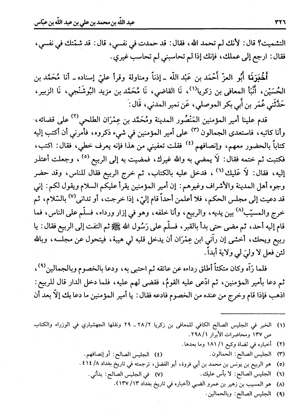 التشميت قال لأنك لم تحمد الله فقال قد حمدت في نفسي قال قد شمتك في نفسي فقال ارجع إلى عملك فإنك إذا لم تحاسبني لم تحاسب غيري أخبرنا أبو العز احمد بن عبد الله إذنا ومناولة وقرأ علي إسناده أنا محمد بن الحسين أنبأ المعافي بن زكريا (1) نا القاضي نا محمد بن مزيد البوشنجي نا الزبير حدثني عمر بن أبي بكر الموصلي عن نمير المدني قال قدم علينا أمير المؤمنين المنصور المدينة ومحمد بن عمران الطلحي (2) على قضائه وأنا كاتبه فاستعدي الجمالون (3) على أمير المؤمنين في شئ ذكروه فأمرني أن أكتب إليه كتابا بالحضور معهم وانصافهم (4) فقلت تعفيني من هذا فإنه يعرف خطي فقال اكتب فكتبت ثم ختمه فقال لا يمضي به والله غيرك فمضيت به إلى الربيع (5) وجعلت اعتذر إليه فقال لا عليك (6) فدخل عليه بالكتاب ثم خرج الربيع فقال للناس وقد حضر وجوه أهل المدينة والاشراف وغيرهم أن أمير المؤمنين يقرأ عليكم السلام ويقول لكم إني قد دعيت إلى مجلس الحكم فلا أعلمن احدا قام إلي إذا خرجت أو تدانى (7 بالسلام ثم خرج والمسيب (8) بين يديه والربيع وأنا خلفه وهو في ازار ورداء فسلم على الناس فما قام إليه أحد ثم مضى حتى بدأ بالقبر فسلم على رسول الله (صلى الله عليه وسلم) ثم التفت إلى الريبع فقال يا ربيع ويحك اخشى أن رآني ابن عمران أن يدخل قلبه لي هيبة فيتحول عن مجلسه وبالله لئن فعل لا ولي لي ولاية أبدا فلما رآه وكان متكئا اطلق رداءه عن عاتقه ثم احتبى به ودعا بالخصوم وبالجمالين (9) ثم دعا بأمير المؤمنين ثم ادعى عليه القوم فقضى لهم عليه فلما دخل الدار قال للربيع اذهب فإذا قام وخرج من عنده من الخصوم فادعه فقال يا أمير المؤمنين ما دعا بك إلا بعد أن