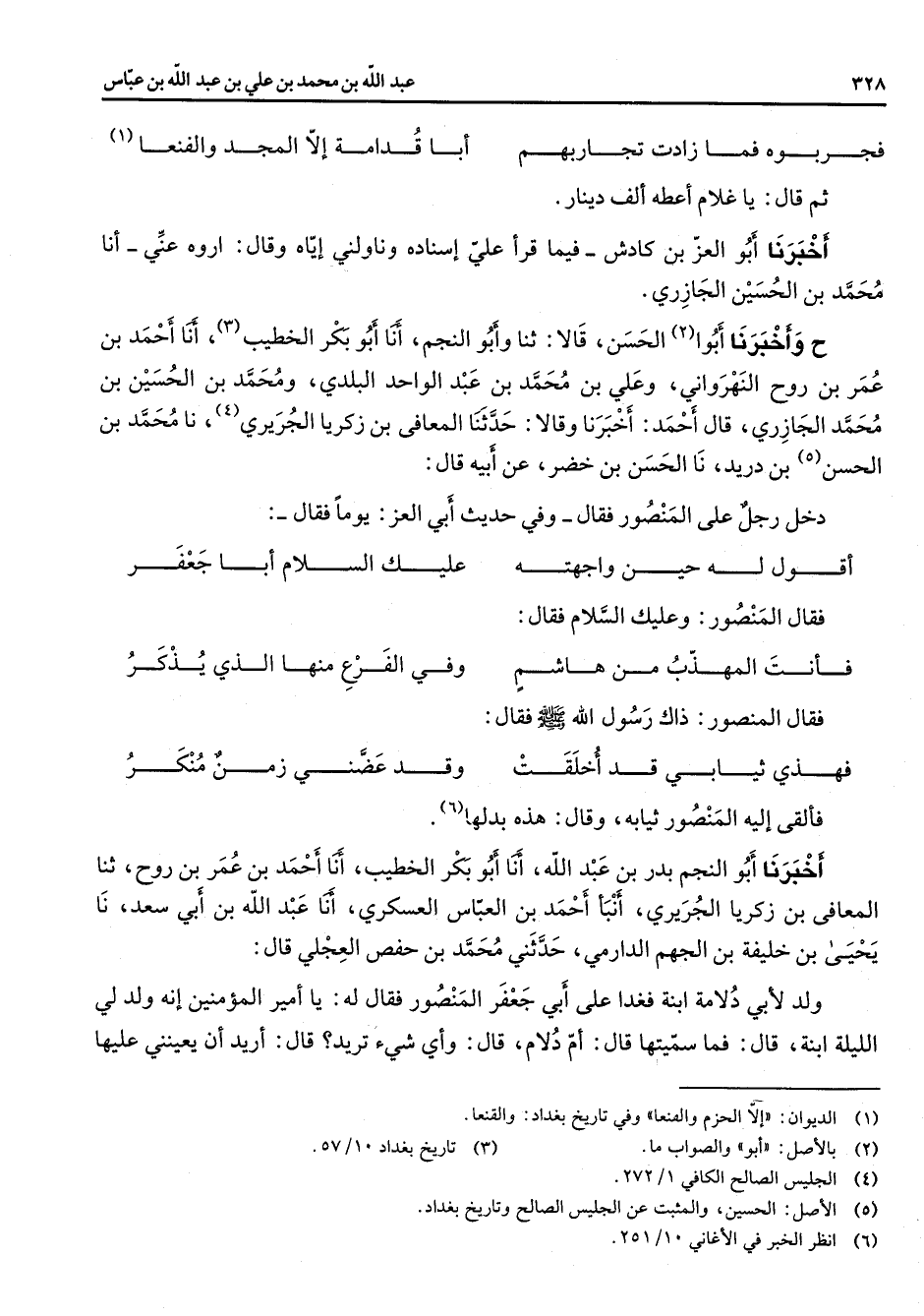 * فجربوه فما زادت تجاربهم * أبا قدامة إلا المجد والفنعا (1) * ثم قال يا غلام أعطه ألف دينار أخبرنا أبو العز بن كادش فيما قرأ علي اسناده وناولني إياه وقال اروه عني أنا محمد بن الحسين الجازري ح وأخبرنا أبو (2) الحسن قالا ثنا وأبو النجم أنا أبو بكر الخطيب (3) أنا احمد بن عمر بن روح النهرواني وعلي بن محمد بن عبد الواحد البلدي ومحمد بن الحسين بن محمد الجازري قال احمد أخبرنا وقالا حدثنا المعافى بن زكريا الجريري (4) نا محمد بن الحسن (5) بن دريد نا الحسن بن خضر عن أبيه قال دخل رجل على المنصور فقال وفي حديث أبي العز يوما فقال * أقول له حين واجهته * عليك السلام أبا جعفر * فقال المنصور وعليك السلام فقال * فأنت المهذب من هاشم * وفي الفرع منها الذي يذكر * فقال المنصور ذاك رسول الله (صلى الله عليه وسلم) فقال * فهذي ثيابي قد أخلقت * وقد عضني زمن منكر * فألقى إليه المنصور ثيابه وقال هذه بدلها (6) أخبرنا أبو النجم بدر بن عبد الله أنا أبو بكر الخطيب أنا احمد بن عمر بن روح ثنا المعافي بن زكريا الجريري أنبأ احمد بن العباس العسكري أنا عبد الله بن أبي سعد نا يحيى بن خليفة بن الجهم الدارمي حدثني محمد بن حفص العجلي قال ولد لأبي دلامة ابنة فغدا على أبي جعفر المنصور فقال له يا أمير المؤمنين إنه ولد لي الليلة ابنة قال فما سميتها قال أم دلام قال وأي شئ تريد قال أريد أن يعينني عليها