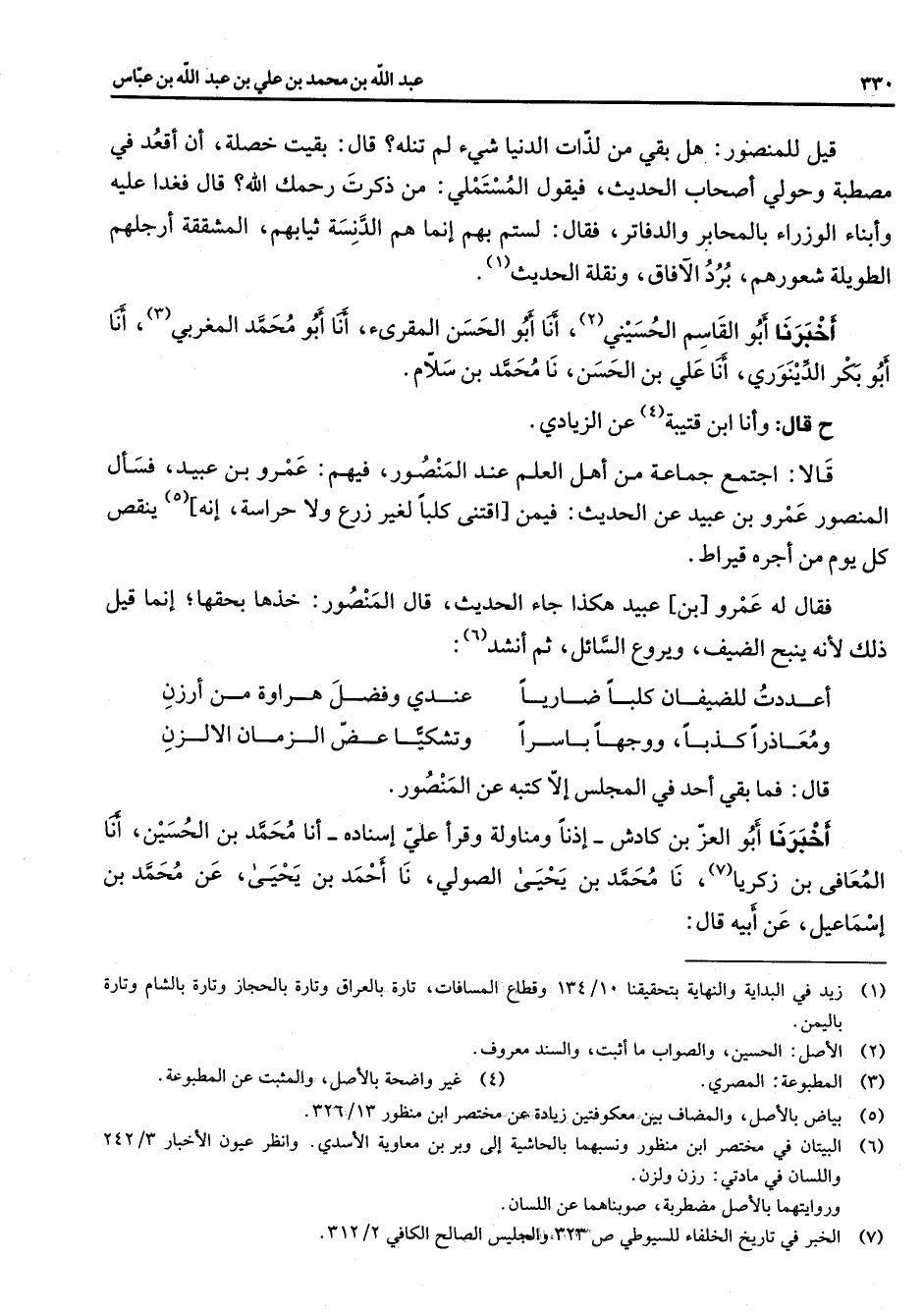 قيل للمنصور هل بقي من لذات الدنيا شئ لم تنله قال بقيت خصلة أن اقعد في مصطبة وحولي أصحاب الحديث فيقول المستملي من ذكرت رحمك الله قال فغدا عليه وابناء الوزراء بالمحابر والدفاتر فقال لستم بهم إنما هم الدنسة ثيابهم المشققة ارجلهم الطويلة شعورهم برد الآفاق ونقلة الحديث (1) أخبرنا أبو القاسم الحسيني (2) أنا أبو الحسن المقرئ أنا أبو محمد المغربي (3) أنا أبو بكر الدينوري أنا علي بن الحسن نا محمد بن سلام ح قال وأنا ابن قتيبة (4) عن الزيادي قالا اجتمع جماعة من أهل العلم عند المنصور فيهم عمرو بن عبيد فسأل المنصور عمرو بن عبيد عن الحديث فيمن اقتنى كلبا لغير زرع ولا حراسة انه (5) ينقص كل يوم من أجره قيراط فقال له عمرو بن عبيد هكذا جاء الحديث قال المنصور خذها بحقها إنما قيل ذلك لانه ينبح الضيف ويروع السائل ثم انشد (6) * أعددت للضيفان كلبا ضاريا * عندي وفضل هراوة من أرزن ومعاذرا كذبا ووجها باسرا * وتشكيا عض الزمان الالزن * قال فما بقي أحد في المجلس إلا كتبه عن المنصور أخبرنا أبو العز بن كادش اذنا ومناولة وقرأ علي اسناده أنا محمد بن الحسين أنا المعافي بن زكريا (7) نا محمد بن يحيى الصولي نا احمد بن يحيى عن محمد بن إسماعيل عن أبيه قال