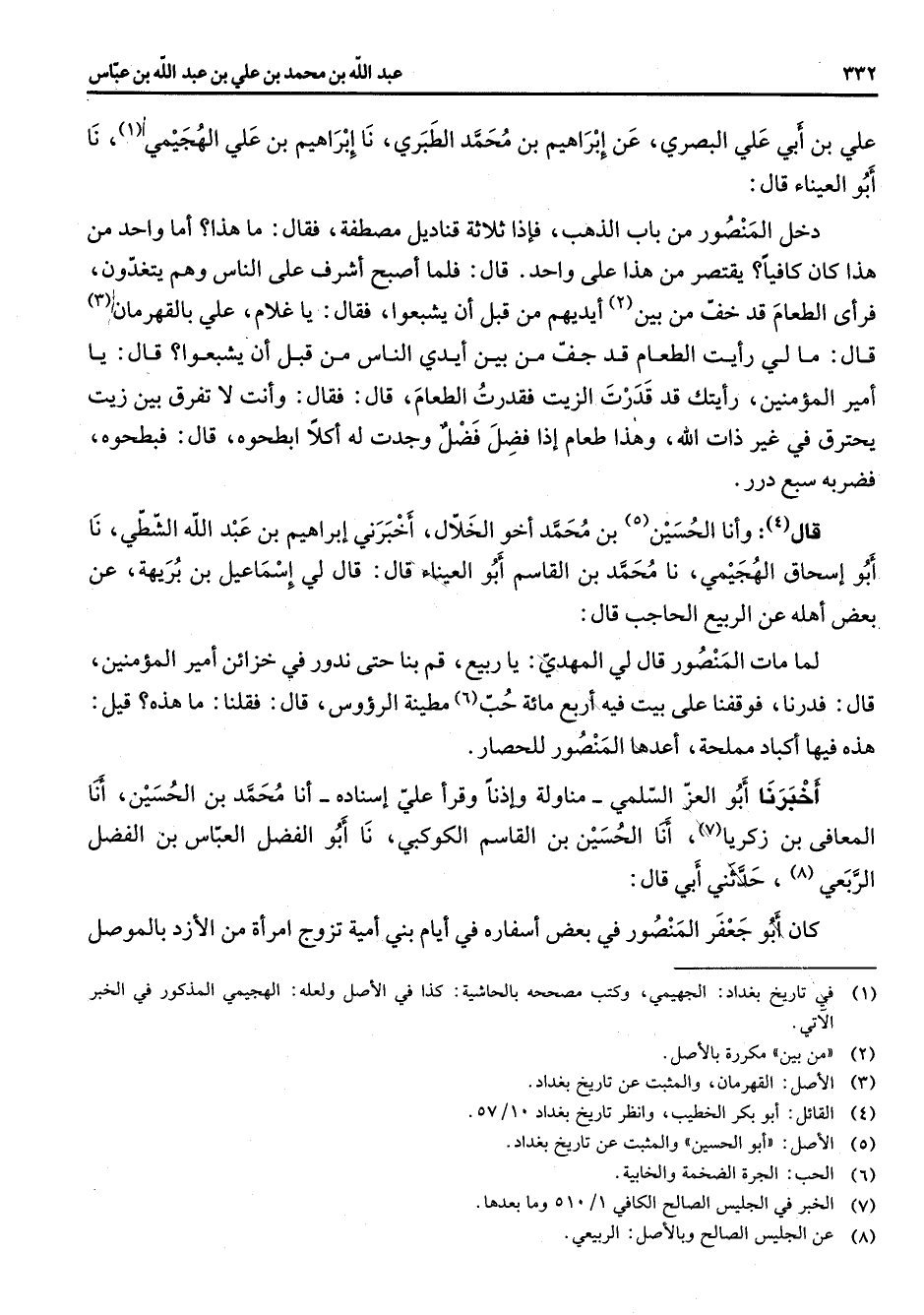 علي بن أبي علي البصري عن إبراهيم بن محمد الطبري نا إبراهيم بن علي الهجيمي (1) نا أبو العيناء قال دخل المنصور من باب الذهب فإذا ثلاثة قناديل مصطفة فقال ما هذا أما واحد من هذا كان كافيا يقتصر من هذا على واحد قال فلما اصبح اشرف على الناس وهم يتغدون فرأى الطعام قد خف من بين (2) أيديهم من قبل أن يشبعوا فقال يا غلام علي بالقهرمان (3) قال ما لي رأيت الطعام قد جف من بين أيدي الناس من قبل أن يشبعوا قال يا أمير المؤمنين رأيتك قد قدرت الزيت فقدرت الطعام قال فقال وأنت لا تفرق بين زيت يحترق في غير ذات الله وهذا طعام إذا فضل فضل وجدت له أكلا ابطحوه قال فبطحوه فضربه سبع درر قال (4) وأنا الحسين (5) بن محمد اخو الخلال اخبرني إبراهيم بن عبد الله الشطي نا أبو إسحاق الهجيمي نا محمد بن القاسم أبو العيناء قال لي إسماعيل بن بريهة عن بعض أهله عن الربيع الحاجب قال لما مات المنصور قال لي المهدي يا ربيع قم بنا حتى ندور في خزائن أمير المؤمنين قال فدرنا فوقفنا على بيت فيه أربع مائة حب مطينة الرؤوس قال فقلنا ما هذه قيل هذه فيها اكباد مملحة اعدها المنصور للحصار أخبرنا أبو العز السلمي مناولة واذنا وقرأ علي اسناده أنا محمد بن الحسين أنا المعافى بن زكريا (7) أنا الحسين بن القاسم الكوكبي نا أبو الفضل العباس بن الفضل الربعي (8) حدثني أبي قال كان أبو جعفر في بعض اسفاره في أيام بني أمية تزوج امرأة من الازد بالموصل