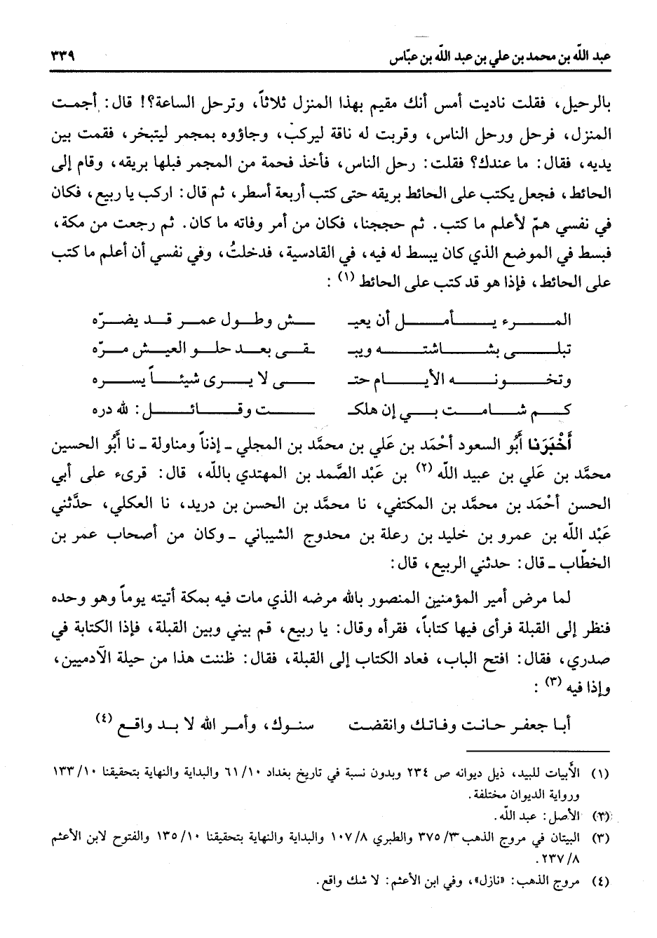 بالرحيل فقلت ناديت امس أنك مقيم بهذا المنزل ثلاثا وترحل الساعة قال اجمت المنزل فرحل ورحل الناس وقربت له ناقة ليركب وجاؤوه بمجمر ليتبخر فقمت بين يديه فقال ما عندك فقلت رحل الناس فأخذ فحمة من المجمر فبلها بريقه وقام إلى الحائط فجعل يكتب على الحائط بريقه حتى كتب أربعة أسطر ثم قال أركب يا ربيع فكان في نفسي هم لأعلم ما كتب ثم حججنا فكان من أمر وفاته ما كان ثم رجعت من مكة فبسط في الموضع الذي كان يبسط له فيه في القادسية فدخلت وفي نفسي أن أعلم ما كتب على الحائط فإذا هو قد كتب على الحائط (1) * المرء يأمل أن يعي * ش وطول عمر قد يضره تبلى بشاشته ويب * قى بعد حلو العيش مره وتخونه الأيام حت * ى لا يرى شيئا يسره كم شامت بي إن هلك * ت وقائل لله دره * أخبرنا أبو السعود احمد بن علي بن محمد بن المجلي إذنا ومناولة نا أبو الحسين محمد بن علي بن عبيد الله (2) بن عبد الصمد بن المهتدي بالله قال قرئ على أبي الحسن احمد بن محمد بن المكتفي نا محمد بن الحسن بن دريد نا العكلي حدثني عبد الله بن عمرو بن خليد بن رعلة بن محدوج الشيباني وكان من أصحاب عمر بن الخطاب قال حدثني الربيع قال لما مرض أمير المؤمنين المنصور بالله مرضه الذي مات فيه بمكة أتيته يوما وهو وحده فنظر إلى القبلة فرأى فيها كتابا فقرأه وقال يا ربيع قم بيني وبين القبلة فإذا الكتابة في صدري فقال افتح الباب فعاد الكتاب إلى القبلة فقال ظننت هذا من حيلة الادميين وإذا فيه (3) * أبا جعفر حانت وفاتك وانقضت * سنوك وأمر الله لا بد واقع (4)