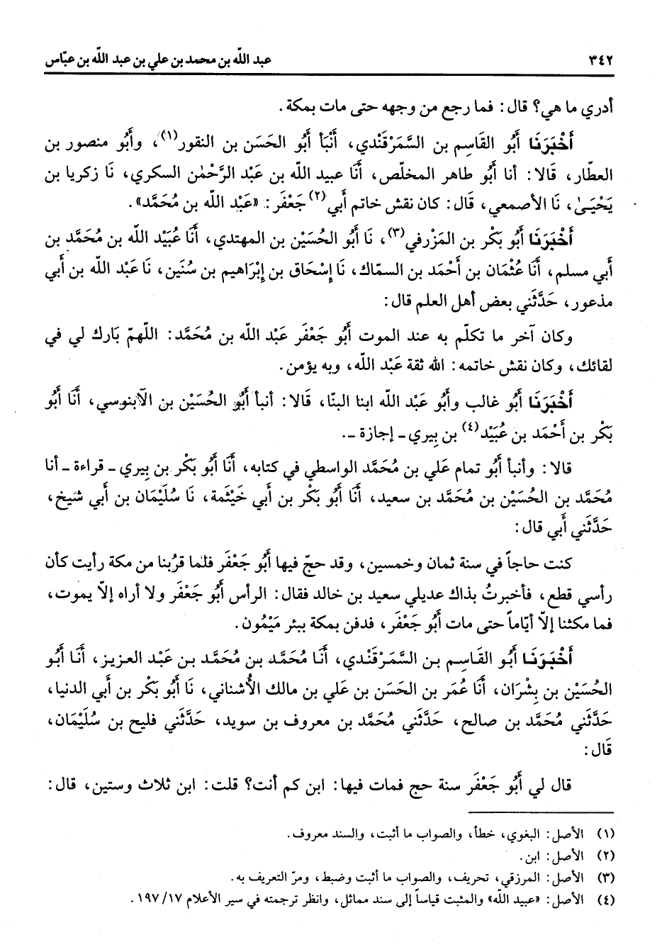 أدري ما هي قال فما رجع من وجهه حتى مات بمكة أخبرنا أبو القاسم بن السمرقندي أنبأ أبو الحسن بن النقور (1) وأبو منصور بن العطار قالا أنا أبو طاهر المخلص أنا عبيد الله بن عبد الرحمن السكري نا زكريا بن يحيى نا الأصمعي قال كان نقش خاتم أبي (2) جعفر عبد الله بن محمد أخبرنا أبو بكر بن المزرفي (3) نا أبو الحسين بن المهتدي أنا عبيد الله بن محمد بن أبي مسلم أنا عثمان بن احمد بن السماك نا إسحاق بن إبراهيم بن سنين نا عبد الله بن أبي مذعور حدثني بعض أهل العلم قال وكان آخر ما تكلم به عند الموت أبو جعفر عبد الله بن محمد اللهم بارك لي في لقائك وكان نقش خاتمه الله ثقة عبد الله وبه يؤمن أخبرنا أبو غالب وأبو عبد الله ابنا البنا قالا أنبأ أبو الحسين بن الآبنوسي أنا أبو بكر بن احمد بن عبيد (4) بن بيري اجازة قالا وأنبأ أبو تمام علي بن محمد الواسطي في كتابه أنا أبو بكر بن بيري قراءة أنا محمد بن الحسين بن محمد بن سعيد أنا أبو بكر بن أبي خيثمة نا سليمان بن أبي شيخ حدثني أبي قال كنت حاجا في سنة ثمان وخمسين وقد حج فيها أبو جعفر فلما قربنا من مكة رأيت كأن رأسي قطع فأخبرت بذاك عديلي سعيد بن خالد فقال الرأس أبو جعفر ولا أراه إلا يموت فما مكثنا إلا أياما حتى مات أبو جعفر فدفن بمكة ببئر ميمون أخبرنا أبو القاسم بن السمرقندي أنا محمد بن محمد بن عبد العزيز أنا أبو الحسين بن بشران أنا عمر بن الحسن بن علي بن مالك الاشناني نا أبو بكر بن أبي الدنيا حدثني محمد بن صالح حدثني محمد بن معروف بن سويد حدثني فليح بن سليمان قال قال لي أبو جعفر سنة حج فمات فيها ابن كم أنت قلت ابن ثلاث وستين قال