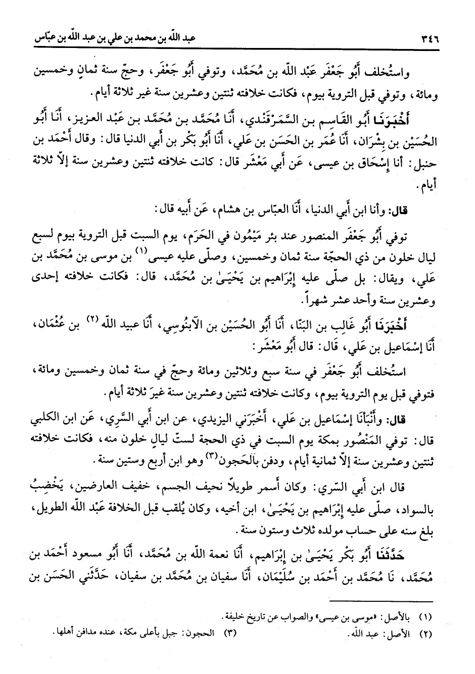 واستخلف أبو جعفر عبد الله بن محمد وتوفي أبو جعفر وحج سنة ثمان وخمسين ومائة وتوفي قبل التروية بيوم فكانت خلافته ثنتين وعشرين سنة غير ثلاثة أيام أخبرنا أبو القاسم بن السمرقندي أنا محمد بن محمد بن عبد العزيز أنا أبو الحسين بن بشران أنا عمر بن الحسن بن علي أنا أبو بكر بن أبي الدنيا قال وقال احمد بن حنبل أنا إسحاق بن عيسى عن أبي معشر قال كانت خلافته ثنتين وعشرين سنة إلا ثلاثة أيام قال وأنا ابن أبي الدنيا أنا العباس بن هشام عن أبيه قال توفي أبو جعفر المنصور عند بئر ميمون في الحرم يوم السبت قبل التروية بيوم لسبع ليال خلون من ذي الحجة سنة ثمان وخمسين وصلى عليه عيسى (1) بن موسى بن محمد بن علي ويقال بل صلى عليه إبراهيم بن يحيى بن محمد قال فكانت خلافته إحدى وعشرين سنة واحد عشر شهرا أخبرنا أبو غالب بن البنا أنا أبو الحسين بن الابنوسي أنا عبيد الله (2) بن عثمان أنا إسماعيل بن علي قال قال أبو معشر استخلف أبو جعفر في سنة سبع وثلاثين ومائة وحج في سنة ثمان وخمسين ومائة فتوفي قبل يوم التروية بيوم وكانت خلافته ثنتين وعشرين سنة غير ثلاثة أيام قال وأنبأنا إسماعيل بن علي اخبرني اليزيدي عن ابن أبي السري عن ابن الكلبي قال توفي المنصور بمكة يوم السبت في ذي الحجة لست ليال خلون منه فكانت خلافته ثنتين وعشرين سنة إلا ثمانية أيام ودفن بالحجون (3) وهو ابن أربع وستين سنه قال ابن أبي السري وكان اسمر طويلا نحيف الجسم خفيف العارضين يخضب بالسواد صلى عليه إبراهيم بن يحيى ابن أخيه وكان يلقب قبل الخلافة عبد الله الطويل بلغ سنة على حساب مولده ثلاث وستون سنة حدثنا أبو بكر يحيى بن إبراهيم أنا نعمة الله بن محمد أنا أبو مسعود احمد بن محمد نا محمد بن احمد بن سليمان أنا سفيان بن محمد بن سفيان حدثني الحسن بن