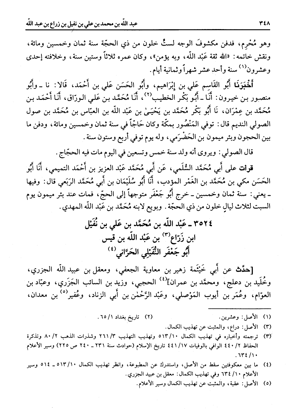 3524 - عبد الله بن محمد بن علي بن نفيل ابن زراع (3) بن عبد الله بن قيس أبو جعفر النفيلي الحراني (4) حدث عن أبي خيثمة زهير بن معاوية الجعفي ومعقل بن عبيد الله الجزري وخليد بن دعلج ومحمد بن عمران (4) الحجبي وزيد بن السائب الجزري وعباد بن العوام وعمر بن أيوب الموصلي وعبد الرحمن بن أبي الزناد وعفير (5) بن معدان