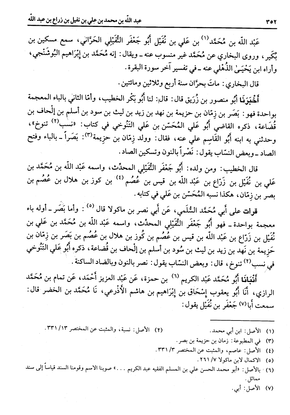 عبد الله بن محمد (1) بن علي بن نفيل أبو جعفر النفيلي الحراني سمع مسكين بن بكير وروى البخاري عن محمد غير منسوب عنه ويقال انه محمد بن إبراهيم البوشنجي وأراه ابن يحيى الذهلي عنه في تفسير آخر سورة البقرة قال البخاري مات بحران سنة أربع وثلاثين ومائتين أخبرنا أبو منصور بن زريق قال قال لنا أبو بكر الخطيب واما الثاني بالباء المعجمة بواحدة فهو بصر بن زمان بن حزيمة بن نهد بن زيد بن ليث بن سود بن اسلم بن الحاف بن قضاعة ذكره القاضي أبو علي المحسن بن علي التنوخي في كتاب نسب (2) تنوخ وحدثني به ابنه أبو القاسم علي عنه فقال وولد زمان بن حزيمة (3) بصرا بالباء وفتح الصاد وبعض النساب يقول نصرا بالنون وتسكين الصاد قال الخطيب ومن ولده أبو جعفر النفيلي المحدث واسمه عبد الله بن محمد بن علي بن نفيل بن زراع بن عبد الله بن قيس بن عصم (4) بن كوز بن هلال بن عصم بن بصر بن زمان هكذا نسبه المحسن بن علي في كتابه قرأت على أبي محمد السلمي عن أبي نصر بن ماكولا قال (5) واما بصر اوله باء معجمة بواحدة فهو أبو جعفر النفيلي المحدث واسمه عبد الله بن محمد بن علي بن نفيل بن زراع بن عبد الله بن قيس بن عصم بن كوز بن هلال بن عصم بن بصر بن زمان بن حزيمة بن نهد بن زيد بن ليث بن سود بن اسلم بن الحاف بن قضاعة ذكره أبو علي التنوخي في نسب (2) تنوخ قال وبعض النساب يقول نصر بالنون وبالضاد الساكنة أنبأنا أبو محمد عبد الكريم (6) بن حمزة عن عبد العزيز احمد عن تمام بن محمد الرازي أنا أبو يعقوب إسحاق بن إبراهيم بن هاشم الاذرعي نا محمد بن الخضر قال سمعت أبا (7) جعفر بن نفيل يقول