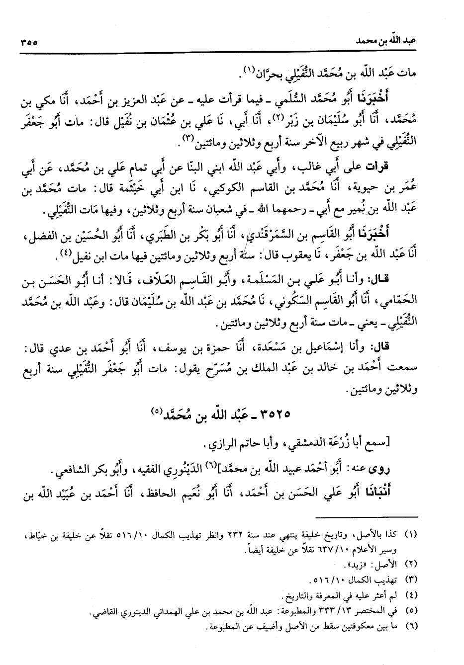 مات عبد الله بن محمد النفيلي بحران (1) أخبرنا أبو محمد السلمي فيما قرأت عليه عن عبد العزيز بن احمد أنا مكي بن محمد أنا أبو سليمان بن زبر (2) أنا أبي نا علي بن عثمان بن نفيل قال مات أبو جعفر النفيلي في شهر ربيع الآخر سنة أربع وثلاثين ومائتين (3) قرأت على أبي غالب وأبي عبد الله ابني البنا عن أبي تمام علي بن محمد عن أبي عمر بن حيوية أنا محمد بن القاسم الكوكبي نا ابن أبي خيثمة قال مات محمد بن عبد الله بن نمير مع أبي رحمهما الله في شعبان سنة أربع وثلاثين وفيها مات النفيلي أخبرنا أبو القاسم بن السمرقندي أنا أبو بكر بن الطبري أنا أبو الحسين بن الفضل أنا عبد الله بن جعفر نا يعقوب قال سنة أربع وثلاثين ومائتين فيها مات ابن نفيل (4) قال وأنا أبو علي بن المسلمة وأبو القاسم العلاف قالا أنا أبو الحسن بن الحمامي أنا أبو القاسم السكوني نا محمد بن عبد الله بن سليمان قال وعبد الله بن محمد النفيلي يعني مات سنة أربع وثلاثين ومائتين قال وأنا إسماعيل بن مسعدة أنا حمزة بن يوسف أنا أبو احمد بن عدي قال سمعت احمد بن خالد بن عبد الملك بن مسرح يقول مات أبو جعفر النفيلي سنة أربع وثلاثين ومائتين 3525 عبد الله بن محمد (5) سمع أبا زرعة الدمشقي وأبا حاتم الرازي روى عنه أبو احمد عبيد الله بن محمد (6) الدينوري الفقيه وأبو بكر الشافعي أنبأنا أبو علي الحسن بن احمد أنا أبو نعيم الحافظ أنا احمد بن عبيد الله بن