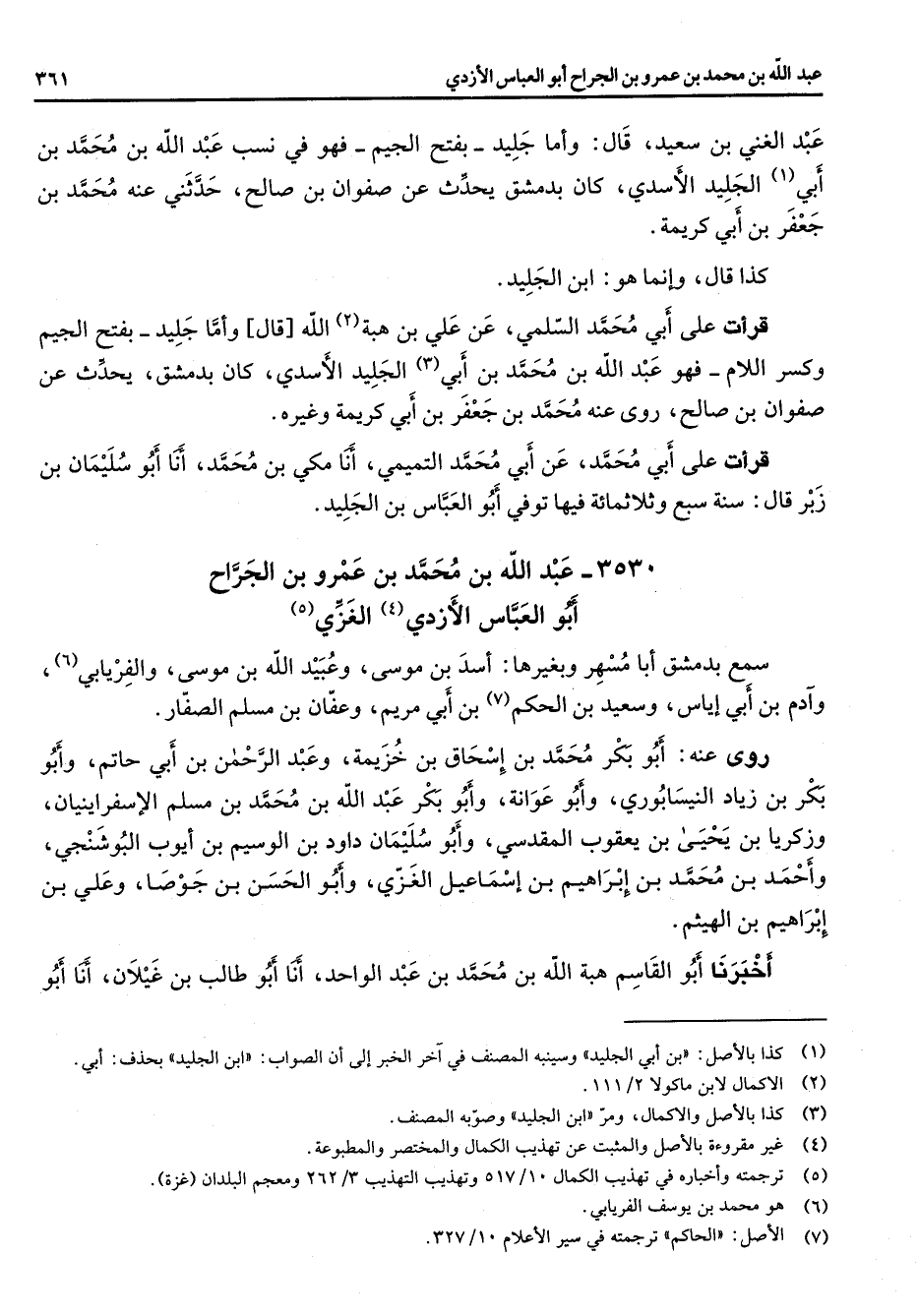 3530 - عبد الله بن محمد بن عمرو بن الجراح أبو العباس الازدي (4) الغزي (5) سمع بدمشق أبا مسهر وبغيرها أسد بن موسى وعبيد الله بن موسى والفريابي (6) وآدم بن أبي اياس وسعيد بن الحكم (7) بن أبي مريم وعفان بن مسلم الصفار روى عنه أبو بكر محمد بن إسحاق بن خزيمة وعبد الرحمن بن أبي حاتم وأبو بكر بن زياد النيسابوري وأبو عوانة وأبو بكر عبد الله بن محمد بن مسلم الاسفراينيان وزكريا بن يحيى بن يعقوب المقدسي وأبو سليمان داود بن الوسيم بن أيوب البوشنجي واحمد بن محمد بن إبراهيم بن إسماعيل الغزي وأبو الحسن بن جوصا وعلي بن إبراهيم بن الهيثم أخبرنا أبو القاسم هبة الله بن محمد بن عبد الواحد أنا أبو طالب غيلان أنا أبو