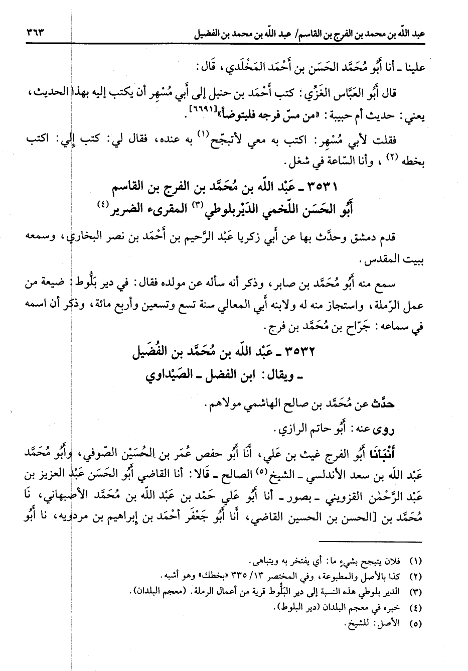 3531 - عبد الله بن محمد بن الفرج بن القاسم أبو الحسن اللخمي الديربلوطي (3) المقرئ الضرير (4) قدم دمشق وحدث بها عن أبي زكريا عبد الرحيم بن احمد بن نصر البخاري وسمعه ببيت المقدس سمع منه أبو محمد بن صابر وذكر انه سأله عن مولده فقال في دير بلوط ضيعة من عمل الرملة واستجاز منه له ولابنه أبي المعالي سنة تسع وتسعين واربع مائة وذكر أن اسمه في سماعه جراح بن محمد بن فرج