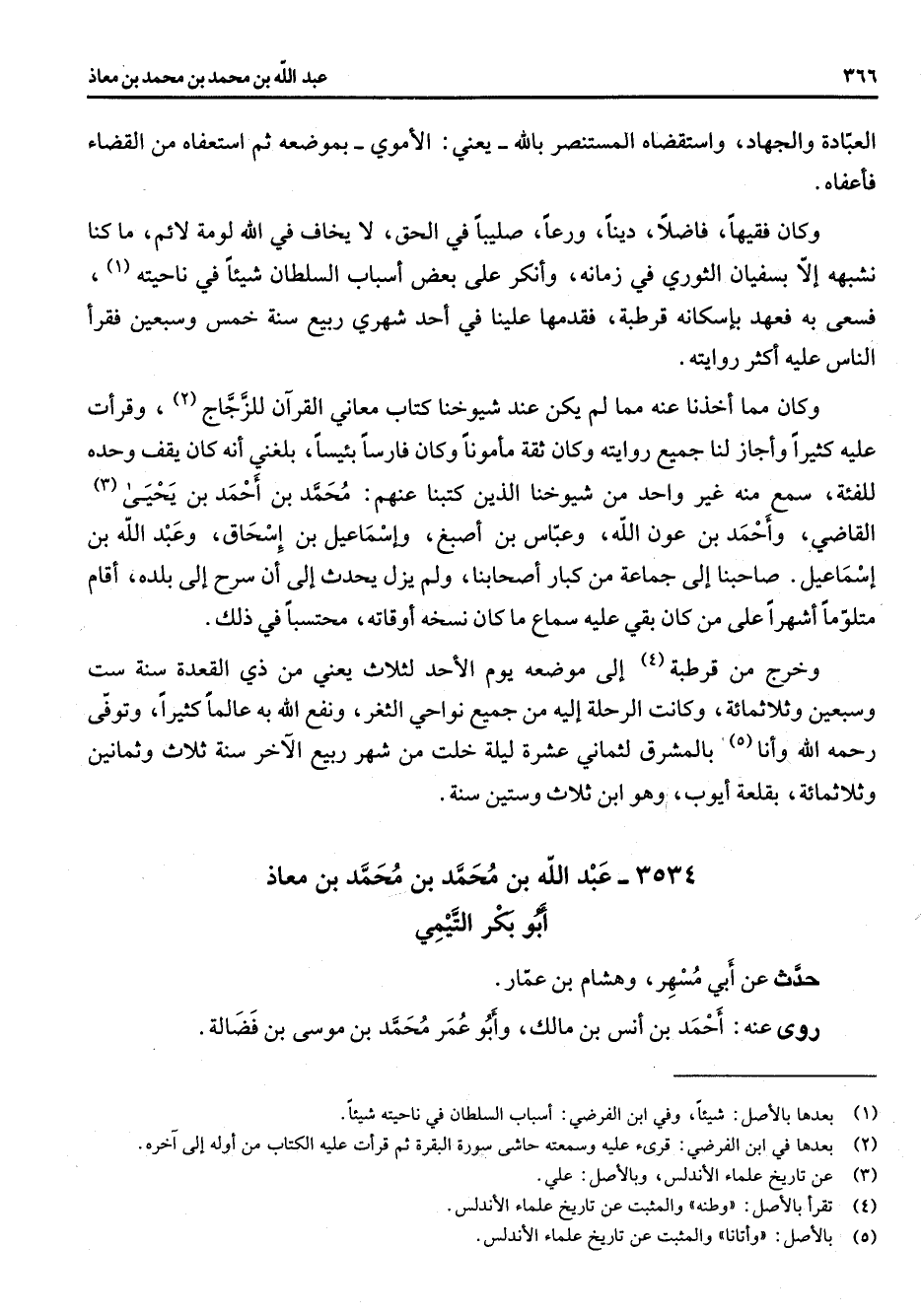 العبادة والجهاد واستقضاه المستنصر بالله يعني الأموي بموضعه ثم استعفاه من القضاء فأعفاه وكان فقيها فاضلا دينا ورعا صليبا في الحق لا يخاف في الله لومة لائم ما كنا نشبهه إلا بسفيان الثوري في زمانه وانكر على بعض اسباب السلطان شيئا في ناحيته (1) فسعى به فعهد باسكانه قرطبة فقدمها علينا في أحد شهري ربيع سنة خمس وسبعين فقرأ الناس عليه اكثر روايته وكان مما اخذنا عنه مما لم يكن عند شيوخنا كتاب معاني القرآن للزجاج (2) وقرأت عليه كثيرا وأجاز لنا جميع روايته وكان ثقة مأمونا وكان فارسا بئيسا بلغني انه كان يقف وحده للفئة سمع منه غير واحد من شيوخنا الذين كتبنا عنهم محمد بن احمد بن يحيى (3) القاضي واحمد بن عون الله وعباس بن اصبغ وإسماعيل بن إسحاق وعبد الله بن إسماعيل صاحبنا إلى جماعة من كبار اصحابنا ولم يزل يحدث إلى أن سرح إلى بلده اقام متلوما اشهرا على من كان بقي عليه سماع ما كان نسخه اوقاته محتسبا في ذلك وخرج من قرطبة (4) إلى موضعه يوم الاحد لثلاث يعني من ذي القعدة سنة ست وسبعين وثلاثمائة وكانت الرحلة إليه من جميع نواحي الثغر ونفع الله به عالما كثيرا وتوفى رحمه الله وأنا (5) بالمشرق لثماني عشرة ليلة خلت من شهر ربيع الآخر سنة ثلاث وثمانين وثلاثمائة بقلعة أيوب وهو ابن ثلاث وستين سنة 3534 عبد الله بن محمد بن محمد بن معاذ أبو بكر التيمي حدث عن أبي مسهر وهشام بن عمار روى عنه احمد بن انس بن مالك وأبو عمر محمد بن موسى بن فضالة