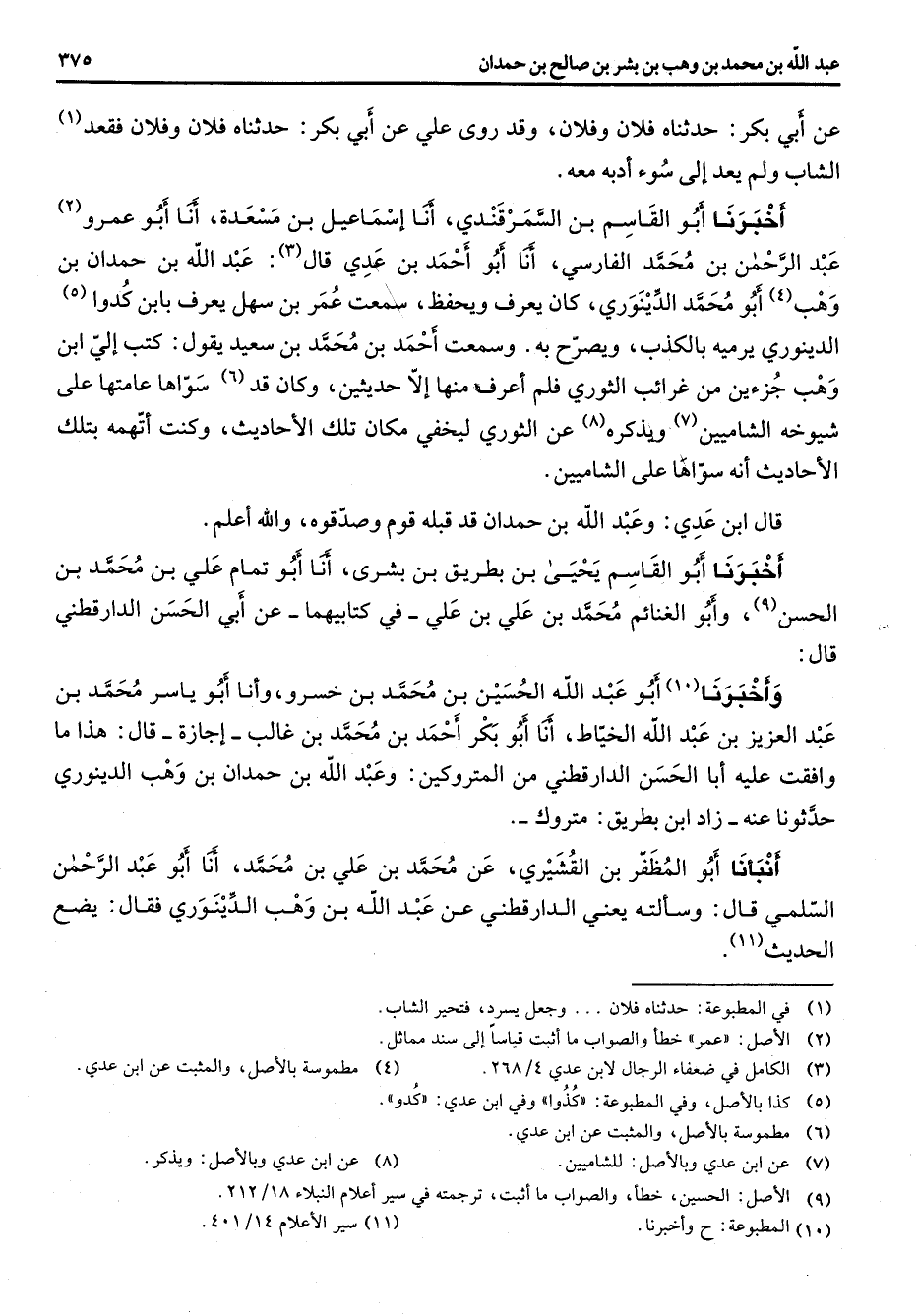 عن أبي بكر حدثناه فلان وفلان وقد روى علي عن أبي بكر حدثناه فلان وفلان فقعد (1) الشاب ولم يعد إلى سوء ادبه معه أخبرنا أبو القاسم بن السمرقندي أنا إسماعيل بن مسعدة أنا أبو عمرو (2) عبد الرحمن بن محمد الفارسي أنا أبو احمد بن عدي قال (3) عبد الله بن حمدان بن وهب (4) أبو محمد الدينوري كان يعرف ويحفظ سمعت عمر بن سهل يعرف بابن كدوا (5) الدينوري يرميه بالكذب ويصرح به وسمعت احمد بن محمد بن سعيد يقول كتب الي ابن وهب جزءين من غرائب الثوري فلم اعرف منها إلا حديثين وكان قد (6) سواها عامتها على شيوخه الشاميين (7) ويذكره (8) عن الثوري ليخفي مكان تلك الأحاديث وكنت اتهمه بتلك الأحاديث انه سواها على الشاميين قال ابن عدي وعبد الله بن حمدان قد قبله قوم وصدقوه والله اعلم أخبرنا أبو القاسم يحيى بن بطريق بن بشري أنا أبو تمام علي بن محمد بن الحسن (9) وأبو الغنائم محمد بن علي بن علي في كتابيهما عن أبي الحسن الدارقطني قال وأخبرنا (10) أبو عبد الله الحسين بن محمد بن خسرو وأنا أبو ياسر محمد بن عبد العزيز بن عبد الله الخياط أنا أبو بكر احمد بن محمد بن غالب اجازة قال هذا ما وافقت عليه أبا الحسن الدارقطني من المتروكين وعبد الله بن حمدان بن وهب الدينوري حدثونا عنه زاد ابن بطريق متروك أنبأنا أبو المظفر بن القشيري عن محمد بن علي بن محمد أنا أبو عبد الرحمن السلمي قال وسألته يعني الدارقطني عن عبد الله بن وهب الدينوري فقال يضع الحديث (11)