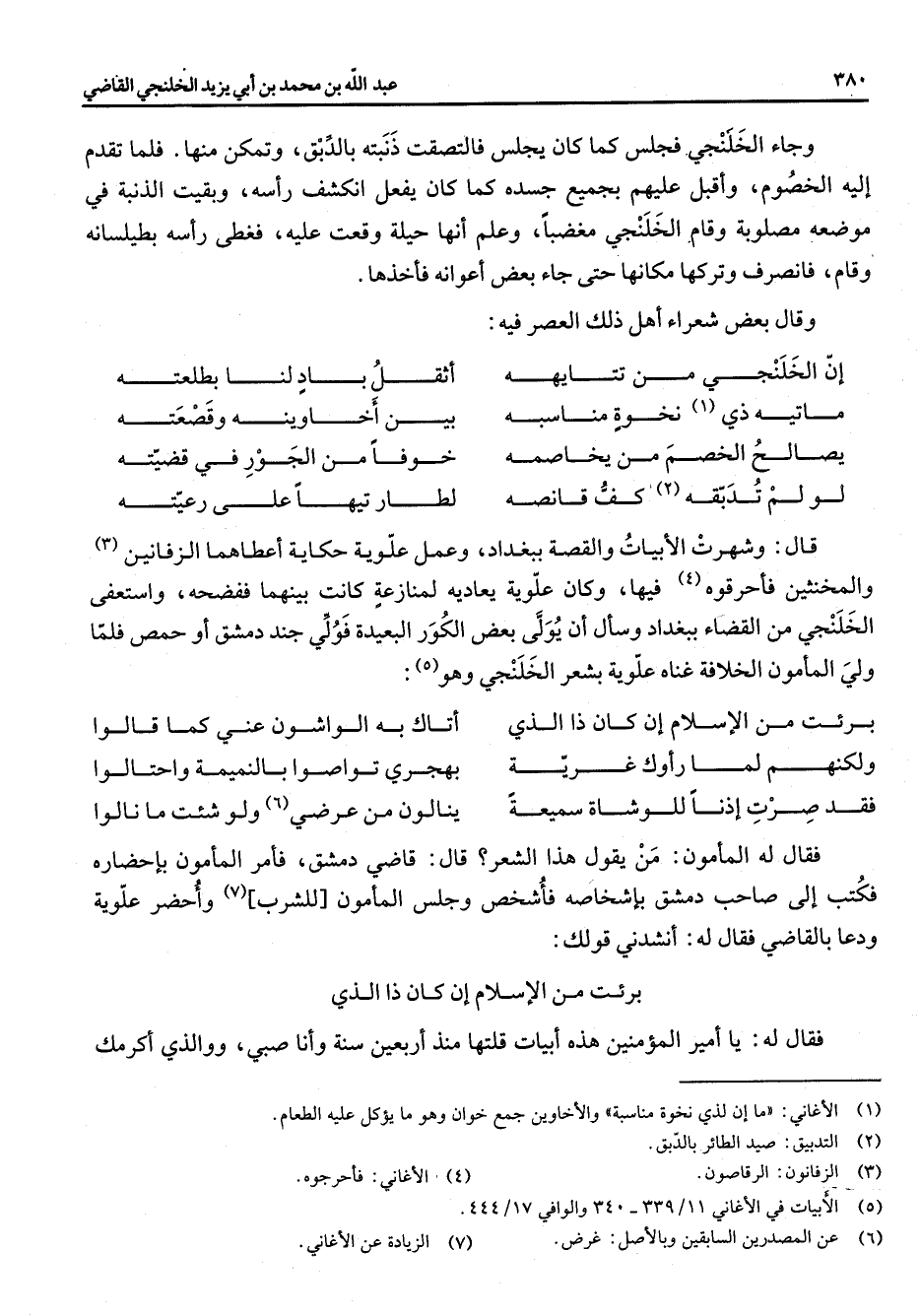 وجاء الخلنجي فجلس كما كان يجلس فالتصقت ذنبته بالدبق وتمكن منها فلما تقدم إليه الخصوم واقبل عليهم بجميع جسده كما كان يفعل انكشف رأسه وبقيت الذنبة في موضعه مصلوبة وقام الخلنجي مغضبا وعلم إنها حيلة وقعت عليه فغطى رأسه بطيلسانه وقام فانصرف وتركها مكانها حتى جاء بعض اعوانه فأخذها وقال بعض شعراء أهل ذلك العصر فيه * أن الخلنجي من تتايهه * اثقل باد لنا بطلعته ماتيه ذي (1) نخوة مناسبه * بين أخاوينه وقصعته يصالح الخصم من يخاصمه * خوفا من الجور في قضيته لو لم تدبقه (2) كف قانصه * لطار تيها على رعيته * قال وشهرت الأبيات والقصة ببغداد وعمل علوية حكاية اعطاهما الزفانين (3) والمخنثين فأحرقوه (4) فيها وكان علوية يعاديه لمنازعة كانت بينهما ففضحه واستعفى الخلنجي من القضاء ببغداد وسأل أن يولى بعض الكور البعيدة فولي جند دمشق أو حمص فلما ولي المأمون الخلافة غناه علوية بشعر الخلنجي وهو (5) * برئت من الإسلام أن كان ذا الذي * اتاك به الواشون عني كما قالوا ولكنهم لما رأوك غرية * بهجري تواصلوا بالنميمة واحتالوا فقد صرت اذنا للوشاة سميعة * ينالون من عرضي (6) ولو شئت ما نالوا * فقال له المأمون من يقول هذا الشعر قال قاضي دمشق فأمر المأمون بإحضاره فكتب إلى صاحب دمشق باشخاصه فأشخص وجلس المأمون للشرب (7) واحضر علوية ودعا بالقاضي فقال له انشدني قولك * برئت من الإسلام أن كان ذا الذي فقال له يا أمير المؤمنين هذه ابيات قلتها منذ أربعين سنة وأنا صبي ووالذي أكرمك