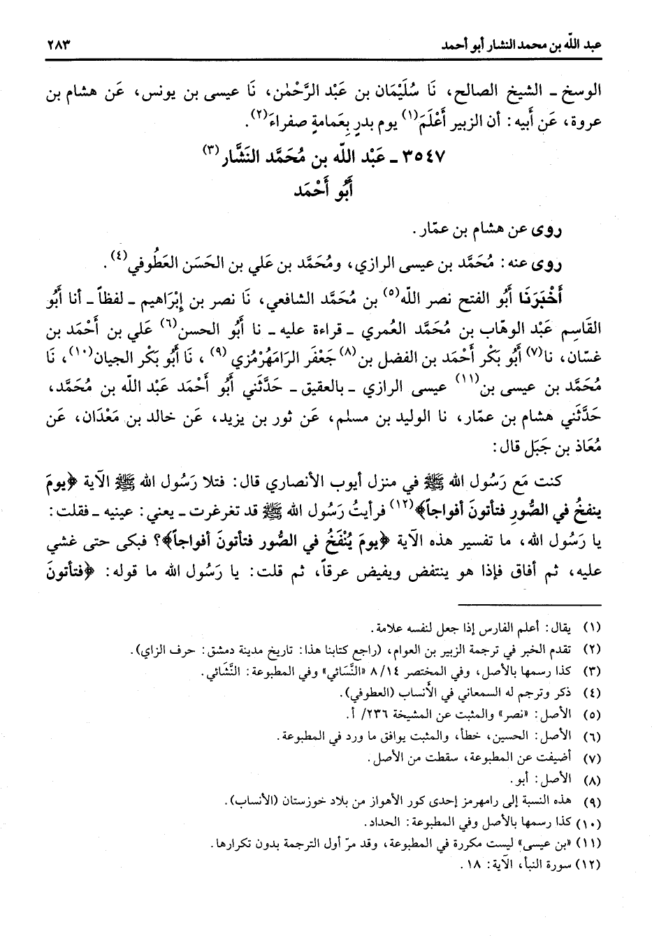 3547 - عبد الله بن محمد النشار (3) أبو احمد روى عن هشام بن عمار روى عنه محمد بن عيسى الرازي ومحمد بن علي بن الحسن العطوفي (4) أخبرنا أبو الفتح نصر الله (5) بن محمد الشافعي نا نصر بن إبراهيم لفظا أنا أبو القاسم عبد الوهاب بن محمد العمري قراءة عليه نا أبو الحسن (6) علي بن احمد بن غسان نا (7) أبو بكر احمد بن الفضل بن (8) جعفر الرامهرمزي (9) نا أبو بكر الجيان (10) نا محمد بن عيسى بن (11) عيسى الرازي بالعقيق حدثني أبو احمد عبد الله بن محمد حدثني هشام بن عمار نا الوليد بن مسلم عن ثور بن يزيد عن خالد بن معدان عن معاذ بن جبل قال كنت مع رسول الله (صلى الله عليه وسلم) في منزل أيوب الأنصاري قال فتلا رسول الله (صلى الله عليه وسلم) الآية " يوم ينفخ في الصور فتأتون افواجا (12) " فرأيت رسول الله (صلى الله عليه وسلم) قد تغرغرت يعني عينيه فقلت يا رسول الله ما تفسير هذه الآية " يوم ينفخ في الصور فتأتون أفواجا " فبكى حتى غشي عليه ثم افاق فإذا هو ينتفض ويفيض عرقا ثم قلت يا رسول الله ما قوله " فتأتون