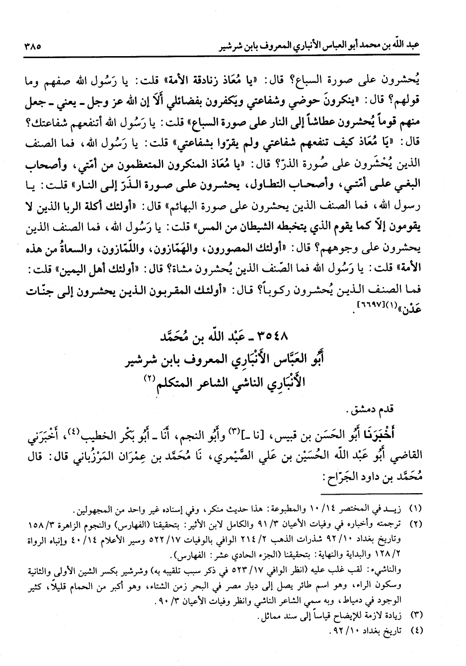 3548 - عبد الله بن محمد أبو العباس الانباري المعروف بابن شرشير الانباري الناشي الشاعر المتكلم (2) قدم دمشق أخبرنا أبو الحسن بن قبيس نا (3) وأبو النجم أنا أبو بكر الخطيب (4) اخبرني القاضي أبو عبد الله الحسين بن علي الصميري نا محمد بن عمران المرزباني قال قال محمد بن داود الجراح