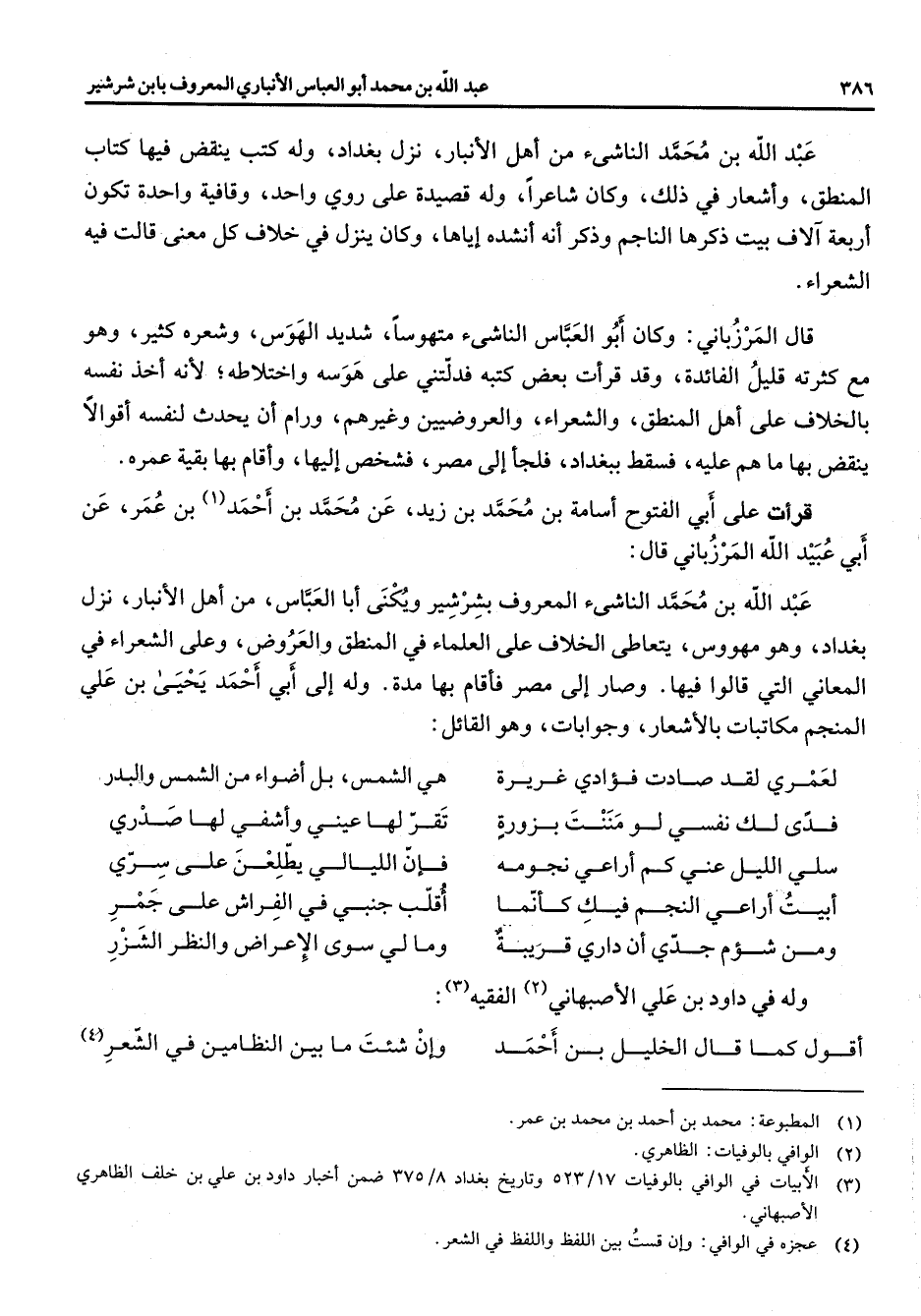 عبد الله بن محمد الناشئ من وأهل الانبار نزل بغداد وله كتب ينقض فيها كتاب المنطق واشعار في ذلك وكان شاعرا وله قصيدة على روي واحد وقافية واحدة تكون أربعة آلاف بيت ذكرها الناجم وذكر انه انشده إياها وكان ينزل في خلاف كل معنى قالت فيه الشعراء قال المرزباني وكان أبو العباس الناشئ متهوسا شديد الهوس وشعره كثير وهو مع كثرته قليل الفائدة وقد قرأت بعض كتبه فدلتني على هوسه واختلاطه لانه اخذ نفسه بالخلاف على أهل المنطق والشعراء والعروضيين وغيرهم ورام أن يحدث لنفسه اقوالا ينقض بها ما هم عليه فسقط ببغداد فلجأ إلى مصر فشخص إليها واقام بها بقية عمره قرأت على أبي الفتوح أسامة بن محمد بن زيد عن محمد بن احمد (1) بن عمر عن أبي عبيد الله المرزباني قال عبد الله بن محمد الناشئ المعروف بشرشير ويكنى أبا العباس من أهل الانبار نزل بغداد وهو مهووس يتعاطى الخلاف على العلماء في المنطق والعروض وعلى الشعراء في المعاني التي قالوا فيها وصار إلى مصر فأقام بها مدة وله إلى أبي احمد يحيى بن علي المنجم مكاتبات بالاشعار وجوابات وهو القائل * لعمري لقد صادت فؤادي غريرة * هي الشمس بل أضواء من الشمس والبدر فدى لك نفسي لو مننت بزورة * تقر لها عيني وأشفي لها صدري سلي الليل عني كم اراعي نجومه * فإن الليالي يطلعن على سري ابيت اراعي النجم فيك كأنما * اقلب جنبي في الفراش على جمر ومن شؤم جدي أن داري قريبة * وما لي سوى الاعراض والنظر الشزر * وله في داود بن علي الاصبهاني (2) الفقيه (3) * اقول كما قال الخليل بن احمد * وان شئت ما بين النظامين في الشعر (4)