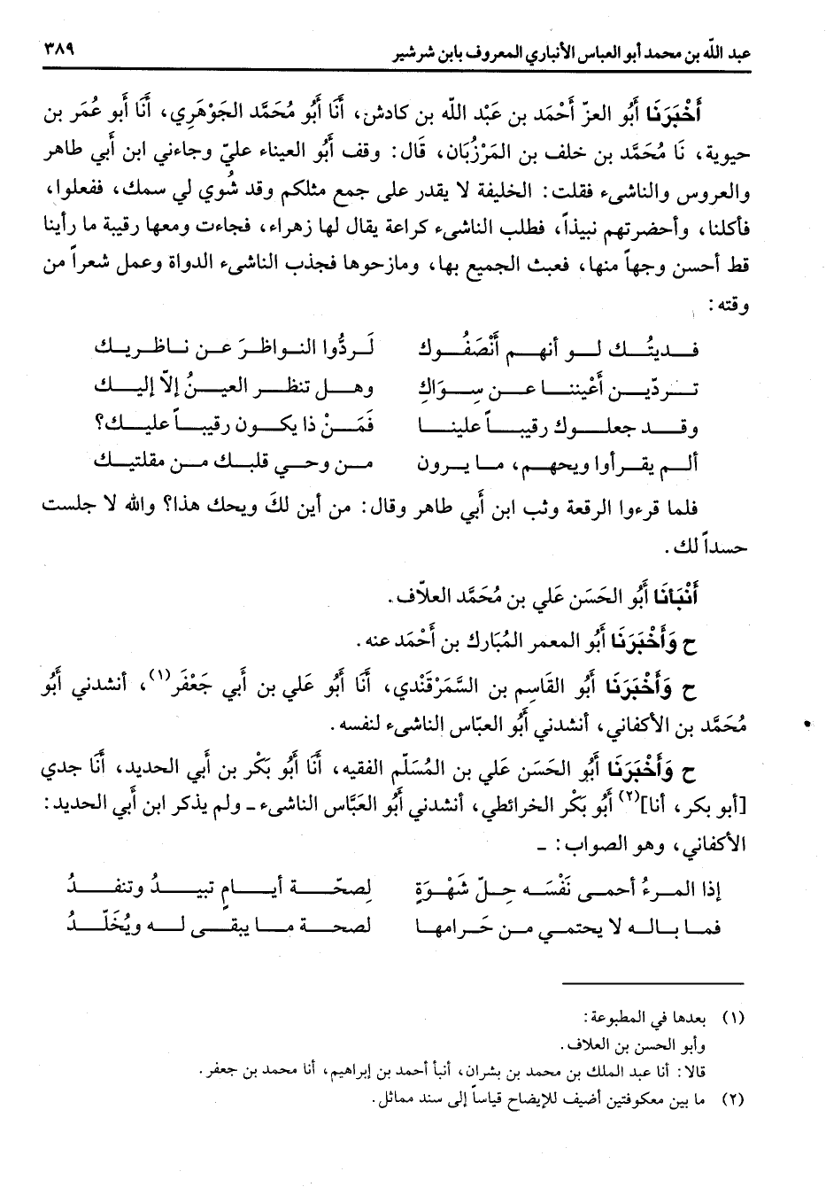أخبرنا أبو العز احمد بن عبد الله بن كادش أنا أبو محمد الجوهري أنا أبو عمر بن حيوية نا محمد بن خلف بن المرزبان قال وقف أبو العيناء علي وجاءني ابن أبي طاهر والعروس والناشئ فقلت الخليفة لا يقدر على جمع مثلكم وقد شوي لي سمك ففعلوا فأكلنا واحضرتهم نبيذا فطلب الناشئ كراعة يقال لها زهراء فجاءت ومعها رقيبة ما رأينا قط احسن وجها منها فعبث الجميع بها ومازحوها فجذب الناشئ الدواة وعمل شعرا من وقته * فديتك لو انهم انصفوك * لردوا النواظر عن ناظريك تردين اعيننا عن سواك * وهل تنظر العين إلا اليك وقد جعلوك رقيبا علينا * فمن ذا يكون رقيبا عليك ألم يقرأوا ويحهم ما يرون * من وحي قلبك من مقلتيك * فلما قرءوا الرقعة وثب ابن أبي طاهر وقال من أين لك ويحك هذا والله لا جلست حسدا لك أنبأنا أبو الحسن علي بن محمد العلاف ح وأخبرنا أبو المعمر المبارك بن احمد عنه ح وأخبرنا أبو القاسم بن السمرقندي أنا أبو علي بن أبي جعفر (1) انشدني أبو محمد بن الاكفاني انشدني أبو العباس الناشئ لنفسه ح وأخبرنا أبو الحسن علي بن المسلم الفقيه أنا أبو بكر بن أبي الحديد أنا جدي أبو بكر أنا (2) أبو بكر الخرائطي انشدني أبو العباس الناشئ ولم يذكر ابن أبي الحديد الاكفاني وهو الصواب * إذا المرء احمى نفسه حل شهوة * لصحة أيام تبيد وتنفد فما باله لا يحتمي من حرامها * لصحة ما يبقى له ويخلد *
