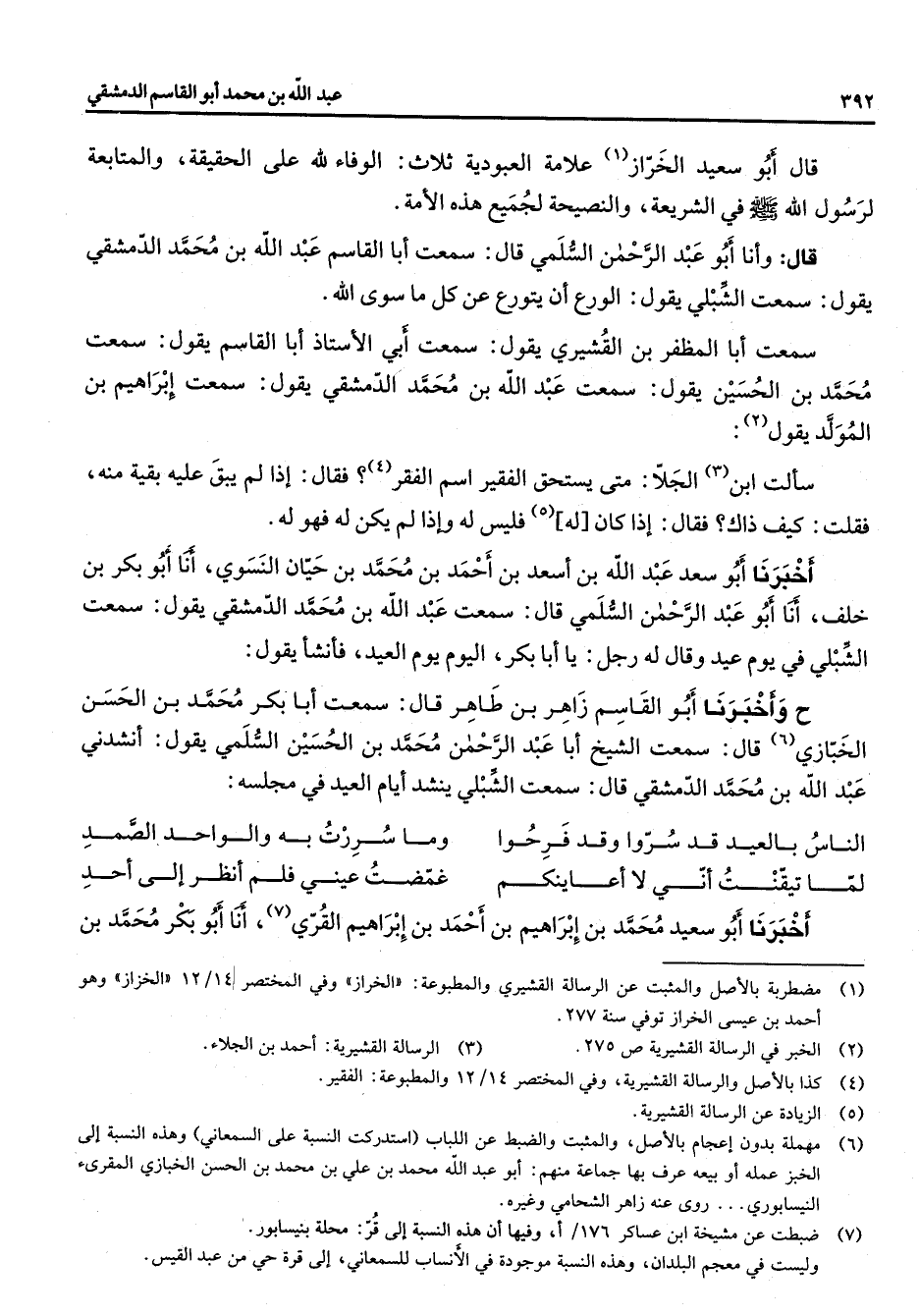 قال أبو سعيد الخراز (1) علامة العبودية ثلاث الوفاء لله فقال على الحقيقة والمتابعة لرسول الله (صلى الله عليه وسلم) في الشريعة والنصيحة لجميع هذه الأمة قال وأنا أبو عبد الرحمن السلمي قال سمعت أبا القاسم عبد الله بن محمد الدمشقي يقول سمعت الشبلي يقول الورع أن يتورع عن كل ما سوى الله سمعت أبا المظفر بن القشيري يقول سعت أبي الأستاذ أبا القاسم يقول سمعت محمد بن الحسين يقول سمعت عبد الله بن محمد الدمشقي يقول سمعت إبراهيم بن المولد يقول (2) سألت ابن (3) الجلا متى يستحق الفقير اسم الفقر (4) فقال إذا لم يبق عليه بقية منه فقلت كيف ذاك فقال إذا كان له (5) فليس له وإذا لم يكن له فهو له أخبرنا أبو سعد عبد الله بن اسعد بن احمد بن محمد بن حيان النسوي أنا أبو بكر بن خلف أنا أبو عبد الرحمن السلمي قال سمعت عبد الله بن محمد الدمشقي يقول سمعت الشبلي في يوم عيد وقال له رجل يا أبا بكر اليوم يوم العيد فأنشأ يقول ح وأخبرنا أبو القاسم زاهر بن طاهر قال سمعت أبا بكر محمد بن الحسن الخبازي (6) قال سمعت الشيخ أبا عبد الرحمن محمد بن الحسين السلمي يقول انشدني عبد الله بن محمد الدمشقي قال سمعت الشبلي ينشد أيام العيد في مجلسه * الناس بالعيد قد سروا وقد فرحوا * وما سررت به والواحد الصمد لما تيقنت أني لا أعاينكم * غمضت عيني فلم انظر إلى أحد * أخبرنا أبو سعيد محمد بن إبراهيم بن أحمد بن إبراهيم القري (7) أنا أبو بكر محمد بن