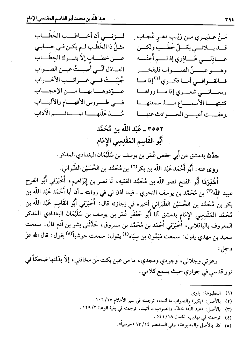 3552 - عبد الله بن محمد أبو القاسم المقدسي الأمام حدث بدمشق عن أبي حفص عمر بن يوسف بن سليمان البغدادي المذكر روى عنه أبو احمد عبد الله بن بكر (2) بن محمد بن الحسين الطبراني أخبرنا أبو الفتح نصر الله بن محمد الفقيه نا نصر بن إبراهيم اخبرني أبو الفرج عبيد الله (3) بن محمد بن يوسف النحوي فيما أذن لي في روايته أن أبا احمد عبد الله بن بكر بن محمد بن الحسين الطبراني اخبره في اجازته قال اخبرني أبو القاسم عبد الله بن محمد المقدسي الإمام بدمشق أنا أبو جعفر عمر بن يوسف بن سليمان البغدادي المذكر المعروف بالباقلاني اخبرني احمد بن محمد بن مسروق حدثني بشر بن آدم قال سمعت سعيد بن مهدي يقول سمعت ميمون بن سياه (4) يقول سمعت حوشبا (5) يقول قال الله عز وجل وعزتي وجلالي وجودي ومجدي ما من عين بكت من مخافتي إلا بدلتها ضحكا في نور قدسي في جواري حيث يسمع كلامي
