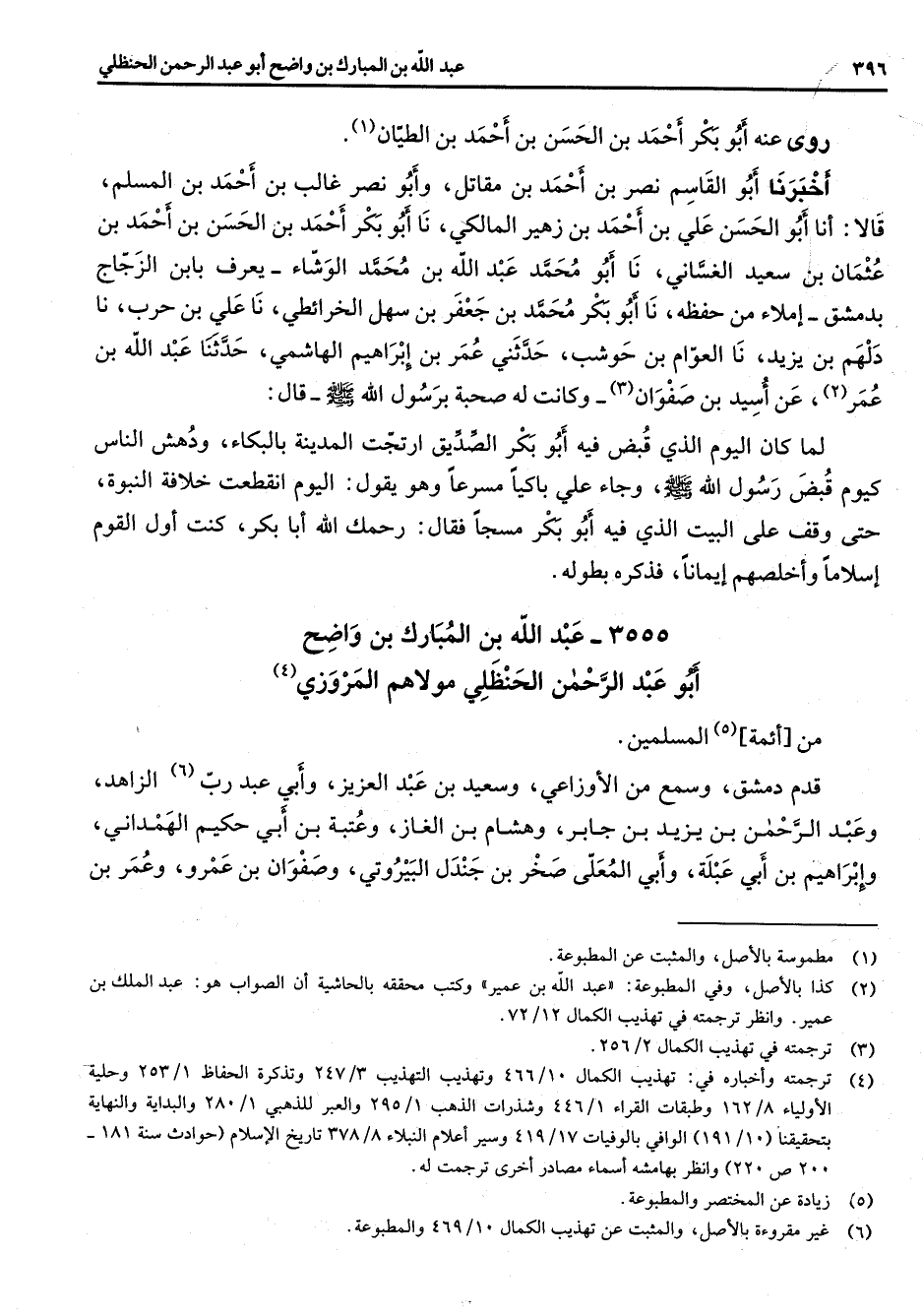 3555 - عبد الله بن المبارك بن واضح أبو عبد الرحمن الحنظلي مولاهم المروزي (4) من أئمة (5) المسلمين قدم دمشق وسمع من الاوزاعي وسعيد بن عبد العزيز وأبي عبد رب (1) الزاهد وعبد الرحمن بن يزيد بن جابر وهشام بن الغاز وعتبة بن أبي حكيم الهمداني وإبراهيم بن أبي عبلة وأبي المعلى صخر بن جندل البيروتي وصفوان بن عمرو وعمر بن