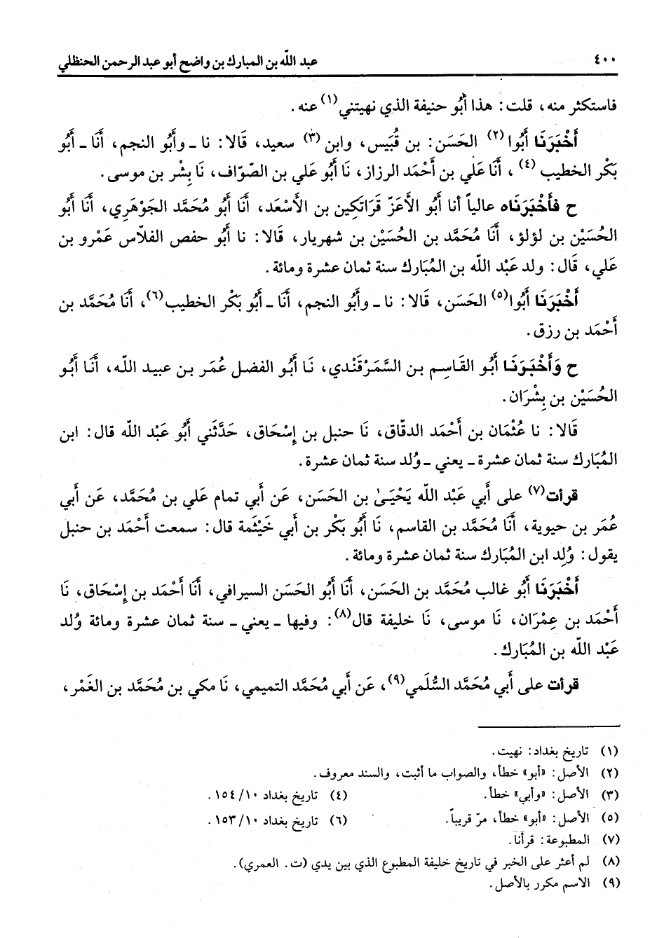 فاستكثر منه قلت هذا أبو حنيفة الذي نهيتني (1) عنه أخبرنا أبو (2) الحسن بن قبيس وابن (3) سعيد قالا نا وأبو النجم أنا أبو بكر الخطيب (4) أنا علي بن احمد الرزاز نا أبو علي بن الصواف نا بشر بن موسى ح فأخبرناه عاليا أنا أبو الأعز قراتكين بن الأسعد أنا أبو محمد الجوهري أنا أبو الحسين بن لؤلؤ أنا محمد بن الحسين بن شهريار قالا نا أبو حفص الفلاس عمرو بن علي قال ولد عبد الله بن المبارك سنة ثمان عشرة ومائة أخبرنا ابوا (5) الحسن قالا نا وأبو النجم أنا أبو بكر الخطيب (6) أنا محمد بن احمد بن رزق ح وأخبرنا أبو القاسم بن السمرقندي نا أبو الفضل عمر بن عبيد الله أنا أبو الحسين بن بشران قالا نا عثمان بن احمد الدقاق نا حنبل بن إسحاق حدثني أبو عبد الله قال ابن المبارك سنة ثمان عشرة يعني ولد سنة ثمان عشرة قرأت (7) على أبي عبد الله يحيى بن الحسن عن أبي تمام علي بن محمد عن أبي عمر بن حيوية أنا محمد بن القاسم نا أبو بكر بن أبي خيثمة قال سمعت احمد بن حنبل يقول ولد ابن المبارك سنة ثمان عشرة ومائة أخبرنا أبو غالب محمد بن الحسن أنا أبو الحسن السيرافي أنا احمد بن إسحاق نا احمد بن عمران نا موسى نا خليفة قال (8) وفيها يعني سنة ثمان عشرة ومائة ولد عبد الله بن المبارك قرأت على أبي محمد السلمي (9) عن أبي محمد التميمي نا مكي بن محمد بن الغمر