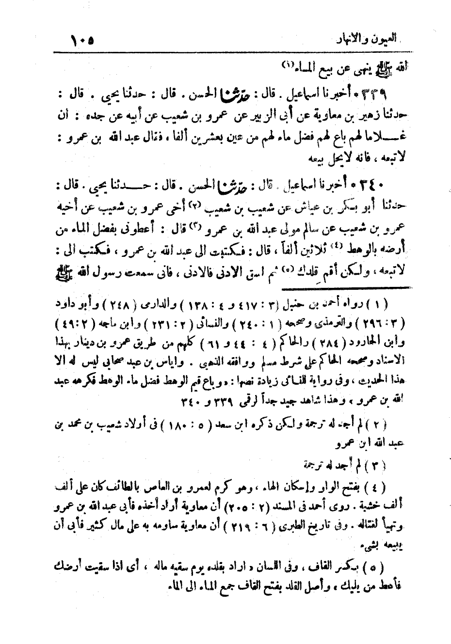 339 - أَخْبَرَنَا إِسْمَاعِيلُ، قَالَ: حَدَّثَنَا الْحَسَنُ، قَالَ: حَدَّثَنَا يَحْيَى، قَالَ: حَدَّثَنَا زُهَيْرُ بْنُ مُعَاوِيَةَ، عَنْ أَبِي الزُّبَيْرِ، عَنْ عَمْرِو بْنِ شُعَيْبٍ، عَنْ أَبِيهِ، عَنْ جَدِّهِ: أَنَّ غُلَامًا لَهُمْ بَاعَ لهم فَضْلَ مَاءٍ لََهُمْ مِنْ عَيْنٍ بِعِشْرِينَ أَلْفًا، فَقَالَ عَبْدُ اللَّهِ بْنُ عَمْرٍو: " §لَا تَبِعْهُ، فَإِنَّهُ لَا يَحِلُّ بَيْعُهُ "