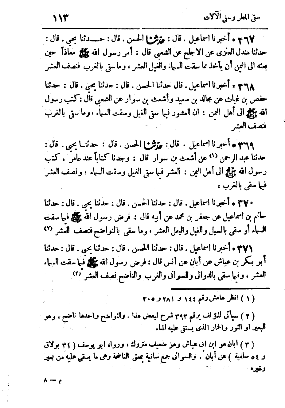 369 - أَخْبَرَنَا إِسْمَاعِيلُ، قَالَ: حَدَّثَنَا الْحَسَنُ، قَالَ: حَدَّثَنَا يَحْيَى، قَالَ: حَدَّثَنَا عَبْدُ الرَّحْمَنِ، عَنْ أَشْعَثَ بْنِ سَوَّارٍ، قَالَ: وَجَدْنَا كِتَابًا عِنْدَ عَامِرٍ، كَتَبَ رَسُولُ اللَّهِ صَلَّى اللهُ عَلَيْهِ وَسَلَّمَ إِلَى أَهْلِ الْيَمَنِ: " §الْعُشْرُ فِيمَا سَقَى الْغَيْلُ وَسَقْتِ السَّمَاءُ، وَنِصْفُ الْعُشْرِ فِيمَا سُقِيَ بِالْغَرْبِ "