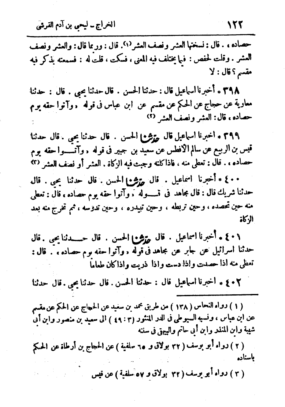 398 - أَخْبَرَنَا إِسْمَاعِيلُ، قَالَ: حَدَّثَنَا الْحَسَنُ، قَالَ: حَدَّثَنَا يَحْيَى، قَالَ: حَدَّثَنَا أَبُو مُعَاوِيَةَ، عَنِ الْحَجَّاجِ، عَنِ الْحَكَمِ، عَنْ مِقْسَمٍ، عَنِ ابْنِ عَبَّاسٍ، فِي قَوْلِهِ: " {وَآتُوا حَقَّهُ يَوْمَ حَصَادِهِ} [الأنعام: 141] قَالَ: " §الْعُشْرُ وَنِصْفُ الْعُشْرِ "