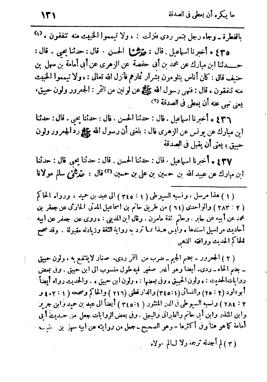 436 - أَخْبَرَنَا إِسْمَاعِيلُ، قَالَ: حَدَّثَنَا الْحَسَنُ، قَالَ: حَدَّثَنَا يَحْيَى، قَالَ: حَدَّثَنَا ابْنُ مُبَارَكٍ، عَنْ يُونُسَ، عَنِ الزُّهْرِيِّ، قَالَ: بَلَغَنِي، أَنَّ رَسُولَ اللَّهِ صَلَّى اللهُ عَلَيْهِ وَسَلَّمَ: " §رَدَّ الْجُعْرُورَ , وَلَوْنَ حُبَيْقٍ " - يَعْنِي: أَنْ يُقْبَلَ فِي الصَّدَقَةِ -