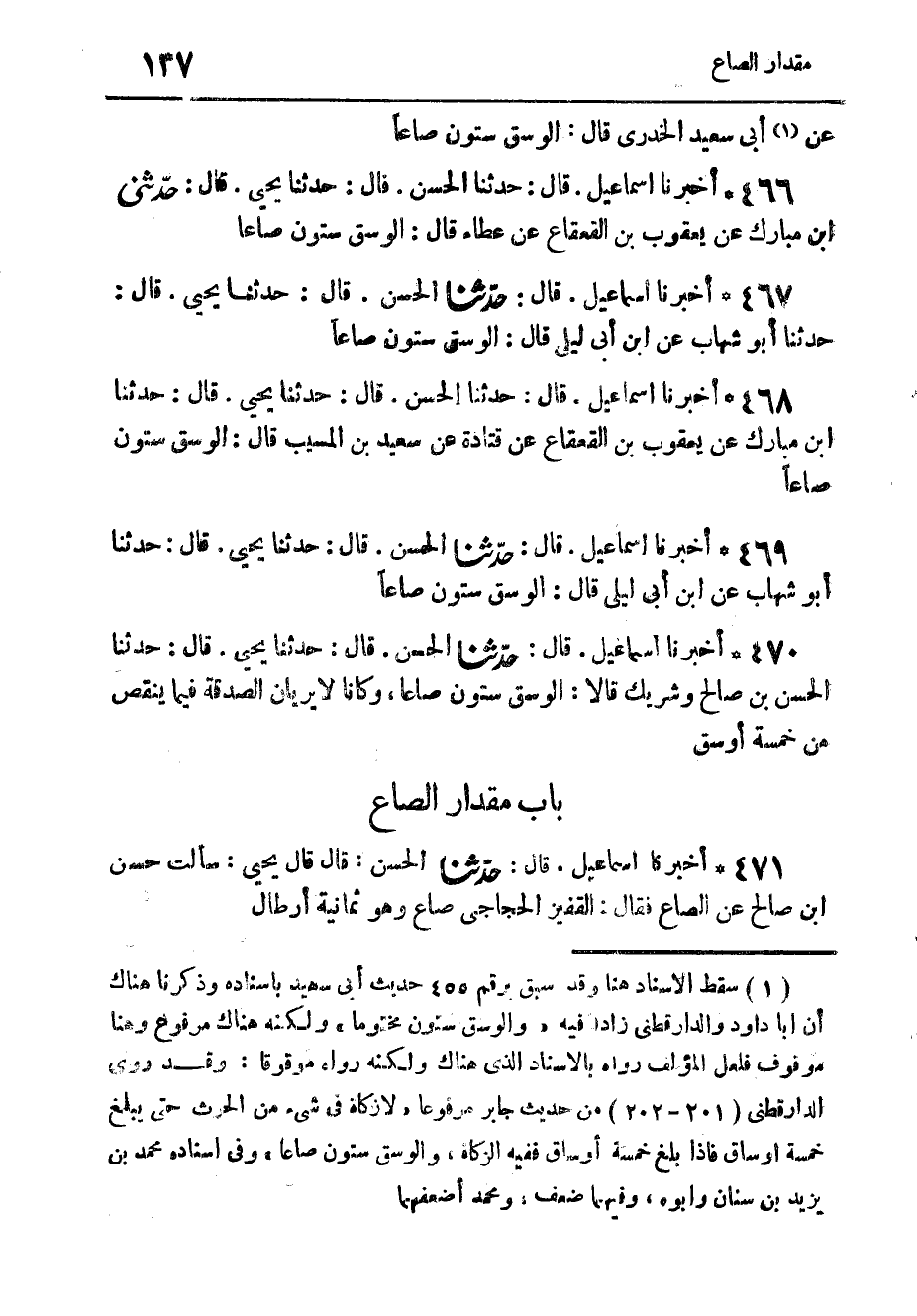 471 - أَخْبَرَنَا إِسْمَاعِيلُ، قَالَ: حَدَّثَنَا الْحَسَنُ، قَالَ: حَدَّثَنَا يَحْيَى، قَالَ: سَأَلْتُ حَسَنَ بْنَ صَالِحٍ، عَنِ الصَّاعِ، فَقَالَ: " §الْقَفِيزُ الْحَجَّاجِيُّ صَاعٌ , وَهُوَ ثَمَانِيَةُ أَرْطَالٍ "