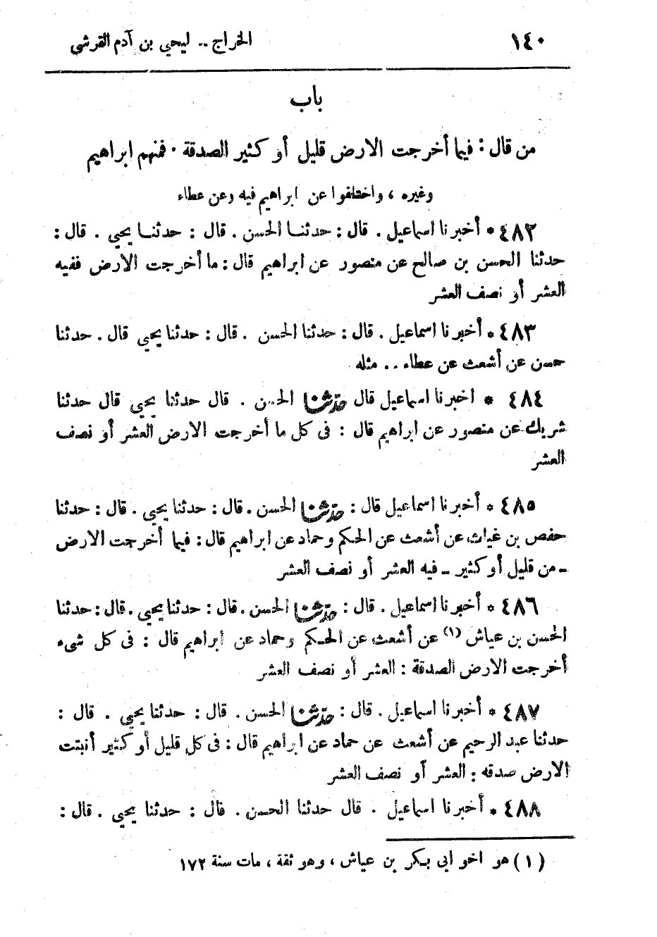485 - أَخْبَرَنَا إِسْمَاعِيلُ، قَالَ: حَدَّثَنَا الْحَسَنُ، قَالَ: حَدَّثَنَا يَحْيَى، قَالَ: حَدَّثَنَا حَفْصُ بْنُ غِيَاثٍ، عَنْ أَشْعَثَ، عَنِ الْحَكَمِ، وَحَمَّادٍ، عَنْ إِبْرَاهِيمَ، قَالَ: " §فِيمَا أَخْرَجَتِ الْأَرْضُ مِنْ قَلِيلٍ أَوْ كَثِيرٍ فِيهِ الْعُشْرُ أَوْ نِصْفُ الْعُشْرِ "