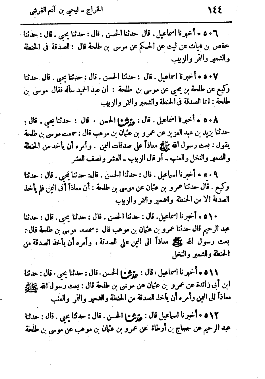 508 - أَخْبَرَنَا إِسْمَاعِيلُ، قَالَ: حَدَّثَنَا الْحَسَنُ، قَالَ: حَدَّثَنَا يَحْيَى، قَالَ: حَدَّثَنَا يَزِيدُ بْنُ عَبْدِ الْعَزِيزِ، عَنْ عَمْرِو بْنِ عُثْمَانَ بْنِ مَوْهَبٍ، قَالَ: سَمِعْتُ مُوسَى بْنَ طَلْحَةَ يَقُولُ: بَعَثَ رَسُولُ اللَّهِ صَلَّى اللهُ عَلَيْهِ وَسَلَّمَ مُعَاذًا عَلَى صَدَقَاتِ الْيَمَنِ، §وَأَمَرَهُ أَنْ يَأْخُذَ مِنَ الْحِنْطَةِ، وَالشَّعِيرِِ، وَالنَّخْلِ وَالْعِنَبِ - أَوْ قاَلَ الزَّبِيبِ - الْعُشْرَ وَنِصْفَ الْعُشْرِ. "