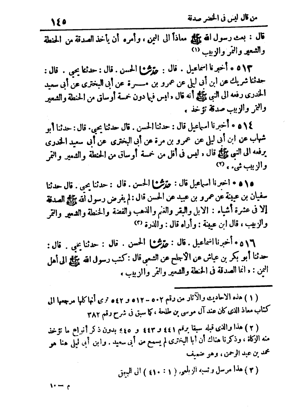 515 - أَخْبَرَنَا إِسْمَاعِيلُ، قَالَ: حَدَّثَنَا الْحَسَنُ، قَالَ: حَدَّثَنَا يَحْيَى، قَالَ: حَدَّثَنَا سُفْيَانُ بْنُ عُيَيْنَةَ، عَنْ عَمْرِو بْنِ عُبَيْدٍ، عَنِ الْحَسَنِ، قَالَ: " §لَمْ يَفْرِضْ رَسُولُ اللَّهِ صَلَّى اللهُ عَلَيْهِ وَسَلَّمَ الصَّدَقَةَ إِلَّا فِي عَشَرَةِ أَشْيَاءَ: الْإِبِلِ، وَالْبَقَرِ، وَالْغَنَمِ، وَالذَّهَبِ، وَالْفِضَّةِ، وَالْحِنْطَةِ، وَالشَّعِيرِ، وَالتَّمْرِ، وَالزَّبِيبِ ". قَالَ ابْنُ عُيَيْنَةَ: وَأُرَاهُ قَالَ: وَالذُّرَةِ