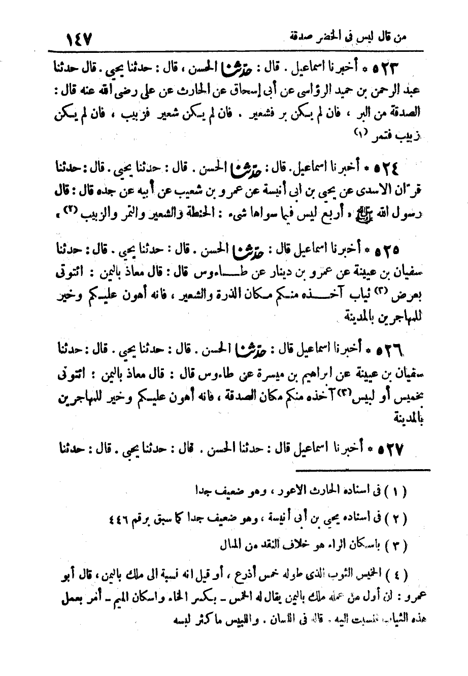 524 - أَخْبَرَنَا إِسْمَاعِيلُ، قَالَ: حَدَّثَنَا الْحَسَنُ، قَالَ: حَدَّثَنَا يَحْيَى، قَالَ: حَدَّثَنَا قُرَّانٌ الْأَسَدِيُّ، عَنْ يَحْيَى بْنِ أَبِي أُنَيْسَةَ، عَنْ عَمْرِو بْنِ شُعَيْبٍ، عَنْ أَبِيهِ، عَنْ جَدِّهِ، قَالَ: قَالَ رَسُولُ اللَّهِ صَلَّى اللهُ عَلَيْهِ وَسَلَّمَ: " §أَرْبَعٌ لَيْسَ فِيهَا سِوَاهَا شَيْءٌ الْحِنْطَةُ، وَالشَّعِيرُ، وَالتَّمْرُ، وَالزَّبِيبُ "