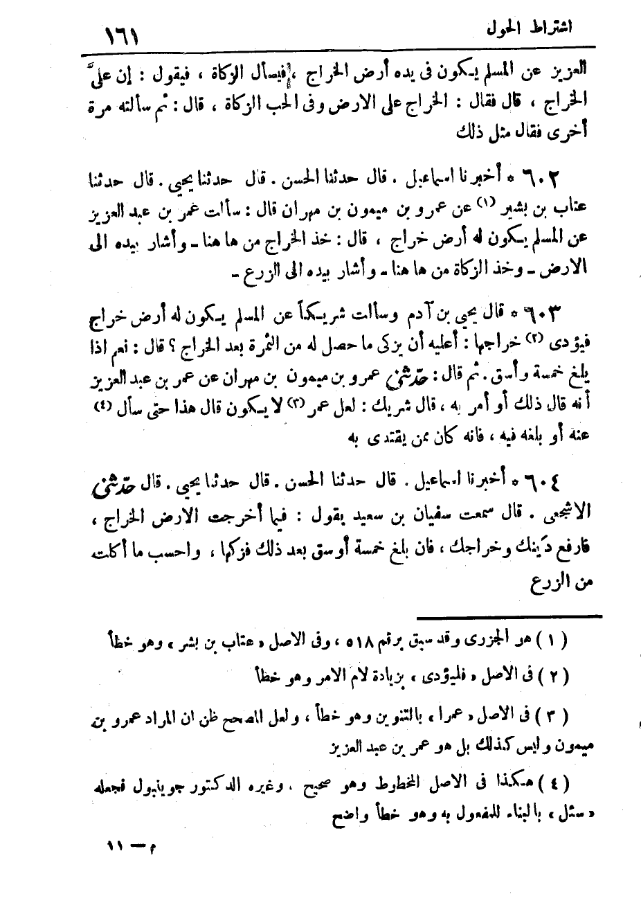 603 - قَالَ يَحْيَى بْنُ آدَمَ: وَسَأَلْتُ شَرِيكًا عَنِ الْمُسْلِمِ يَكُونُ لَهُ أَرْضُ خَرَاجٍ فَيُؤَدِّي خَرَاجَهَا: أَعَلَيْهِ أَنْ يُزَكِّيَ مَا حَصَلَ لَهُ مِنَ الثَّمَرَةِ بَعْدَ الْخَرَاجِ؟ قَالَ: " §نَعَمْ , إِذَا بَلَغَ خَمْسَةَ أَوْسُقٍ "، ثُمَّ قَالَ: حَدَّثَنِي عَمْرُو بْنُ مَيْمُونِ بْنِ مِهْرَانَ، عَنْ عُمَرَ بْنِ عَبْدِ الْعَزِيزِ، أَنَّهُ قَالَ ذَلِكَ , أَوْ أَمَرَ بِهِ. قَالَ شَرِيكٌ: لَعَلَّ عُمَرَ لَا يَكُونُ قَالَ هذا حَتَّى سَأَلَ عَنْهُ , أَوْ بَلَغَهُ فِيهِ، كَانَ مِمَّنْ يُقْتَدَى بِهِ