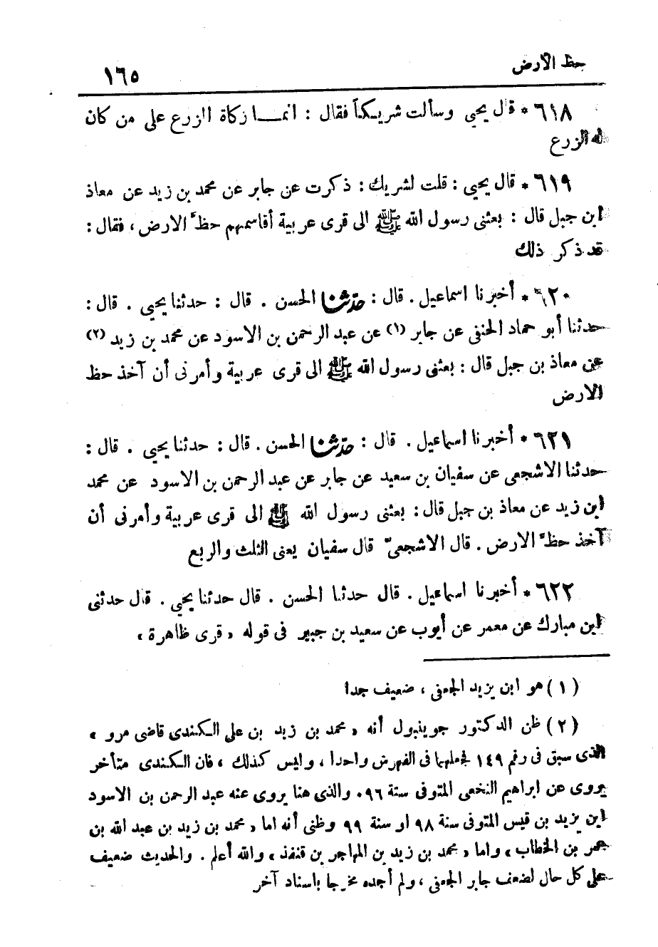 619 - قَالَ يَحْيَى: قُلْتُ لِشَرِيكٍ: ذَكَرْتَ عَنْ جَابِرٍ، عَنْ مُحَمَّدِ بْنِ زَيْدٍ، عَنْ مُعَاذِ بْنِ جَبَلٍ، قَالَ: " §بَعَثَنِي رَسُولُ اللَّهِ صَلَّى اللهُ عَلَيْهِ وَسَلَّمَ إِلَى قُرًى عَرَبِيَّةٍ , أُقَاسِمُهُمْ حَظَّ الْأَرْضِ " فَقَالَ: قَدْ ذُكِرَ ذَلِكَ