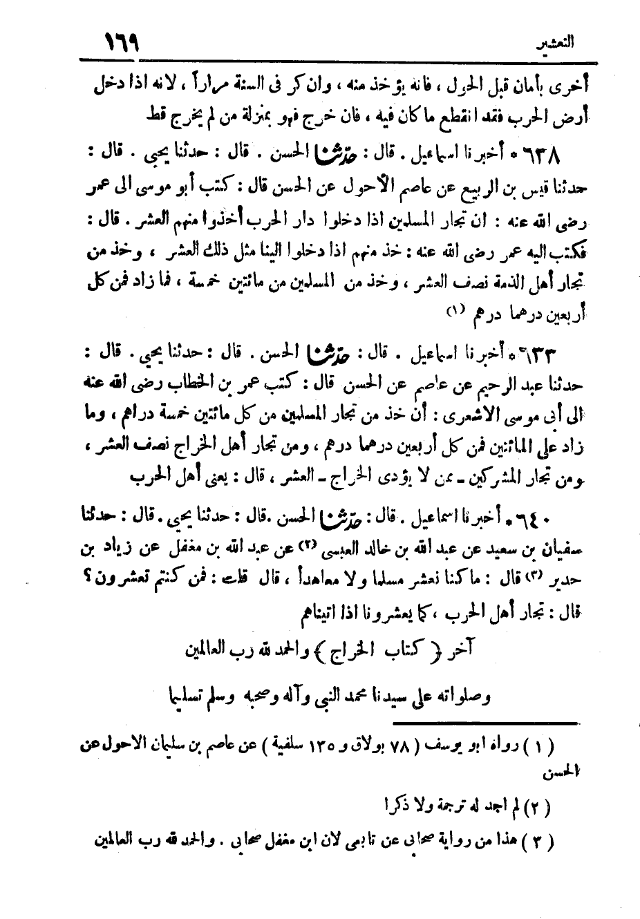 639 - أَخْبَرَنَا إِسْمَاعِيلُ، قَالَ: حَدَّثَنَا الْحَسَنُ، قَالَ: حَدَّثَنَا يَحْيَى، قَالَ: حَدَّثَنَا عَبْدُ الرَّحِيمِ، عَنْ عَاصِمٍ، عَنِ الْحَسَنِ، قَالَ: كَتَبَ عُمَرُ بْنُ الْخَطَّابِ رَضِيَ اللَّهُ عَنْهُ إِلَى أَبِي مُوسَى الْأَشْعَرِيِّ: " §أَنْ خُذْ مِنْ تُجَّارِ الْمُسْلِمِينَ مِنْ كُلِّ مِائَتَيْنِ خَمْسَةَ دَرَاهِمَ، وَمَا زَادَ عَلَى الْمِائَتَيْنِ فَمِنْ كُلِّ أَرْبَعِينَ دِرْهَمًا دِرْهَمٌ، وَمِنْ تُجَّارِ أَهْلِ الْخَرَاجِ نِصْفَ الْعُشْرِ، وَمِنْ تُجَّارِ الْمُشْرِكِينَ مِمَّنْ لَا يُؤَدِّي الْخَرَاجَ الْعُشْرَ، قَالَ: يَعْنِي: أَهْلَ الْحَرْبِ "