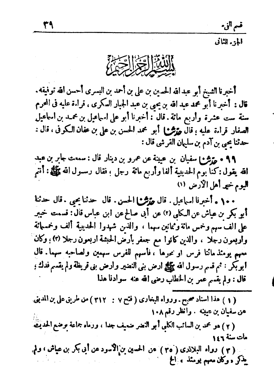 100 - أَخْبَرَنَا إِسْمَاعِيلُ، قَالَ: حَدَّثَنَا الْحَسَنُ، قَالَ: حَدَّثَنَا يَحْيَى، قَالَ: حَدَّثَنَا أَبُو بَكْرِ بْنُ عَيَّاشٍ، عَنِ الْكَلْبِيِّ، عَنْ أَبِي صَالِحٍ، عَنِ ابْنِ عَبَّاسٍ، قَالَ: " قُسِمَتْ خَيْبَرُ عَلَى أَلْفِ سَهْمٍ وَخَمْسِمِائَةٍ وَثَمَانِينَ سَهْمًا، وَالَّذِينَ شَهِدُوا الْحُدَيْبِيَةَ أَلْفٌ وَخَمْسُمِائَةٍ وَأَرْبَعُونَ رَجُلًا، وَالَّذِينَ كَانُوا مَعَ جَعْفَرٍ بِأَرْضِ الْحَبَشَةِ أَرْبَعُونَ رَجُلًا، وَكَانَ مَعَهُمْ يَوْمَئِذٍ مِائَتَا فَرَسٍ أَوْ نَحْوُهَا، فَأَسْهَمَ لِلْفَرَسِ سَهْمَيْنِ وَلِصَاحِبِهِ سَهْمًا، قَالَ أَبُو بَكْرٍ: " ثُمَّ §قَسَمَ رَسُولُ اللَّهِ صَلَّى اللهُ عَلَيْهِ وَسَلَّمَ أَرْضَ بَنِي النَّضِيرِ وَأَرْضَ بَنِي قُرَيْظَةَ وَلَمْ يَقْسِمْ فَدَكًا "، قَالَ: وَلَمْ يَقْسِمْ عُمَرُ بْنُ الْخَطَّابِ رَضِيَ اللَّهُ عَنْهُ سَوَادَنَا هَذَا "