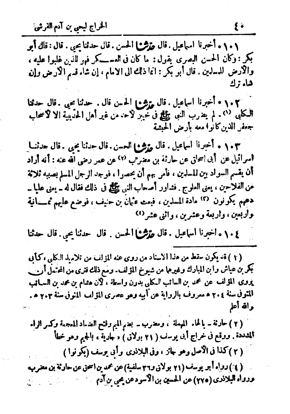 أَخْبَرَنَا إِسْمَاعِيلُ، قَالَ: حَدَّثَنَا الْحَسَنُ، قَالَ: حَدَّثَنَا يَحْيَى، قَالَ: حَدَّثَنَا إِسْرَائِيلُ، عَنْ أَبِي إِسْحَاقَ، عَنْ حَارِثَةَ بْنِ مُضَرِّبٍ، عَنْ عُمَرَ رَضِيَ اللَّهُ عَنْهُ، أَنَّهُ أَرَادَ أَنْ يَقْسِمَ السَّوَادَ بَيْنَ الْمُسْلِمِينَ، فَأَمَرَ بِهِمْ أَنْ يُحْصَوْا , فَوَجَدَ الرَّجُلَ الْمُسْلِمَ يُصِيبُهُ ثَلَاثَةٌ مِنَ الْفَلَّاحِينَ، يَعْنِي: الْعُلُوجَ، فَشَاوَرَ أَصْحَابَ النَّبِيِّ صَلَّى اللهُ عَلَيْهِ وَسَلَّمَ فِي ذَلِكَ , فَقَالَ لَهُ - يَعْنِي عَلِيًّا -: " §دَعْهُمْ يَكُونُونَ مَادَّةَ الْمُسْلِمِينَ، فَبَعَثَ عُثْمَانَ بْنَ حُنَيْفٍ، فَوَضَعَ عَلَيْهِمْ ثَمَانِيَةً وَأَرْبَعِينَ، وَأَرْبَعَةً وَعِشْرِينَ، وَاثْنَيْ عَشَرَ "
