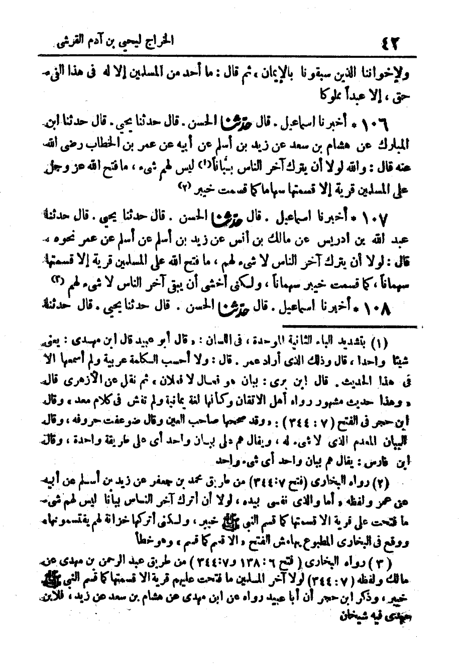 107 - أَخْبَرَنَا إِسْمَاعِيلُ، قَالَ: حَدَّثَنَا الْحَسَنُ، قَالَ: حَدَّثَنَا يَحْيَى، قَالَ: حَدَّثَنَا عَبْدُ اللَّهِ بْنُ إِدْرِيسَ، عَنْ مَالِكِ بْنِ أَنَسٍ، عَنْ زَيْدِ بْنِ أَسْلَمَ، عَنْ أَسْلَمَ، عَنْ عُمَرَ نَحْوَهُ، قَالَ: " لَوْلَا أَنْ يُتْرَكَ آخِرُ النَّاسِ لَا شَيْءَ لَهُمْ، §مَا فَتَحَ اللَّهُ عَلَى الْمُسْلِمِينَ قَرْيَةً إِلَّا قَسَمْتُهَا سُهْمَانًا، كَمَا قُسِمَتْ خَيْبَرُ سُهْمَانًا، وَلَكِنِّي أَخْشَى أَنْ يَبْقَى آخِرُ النَّاسِ لَا شَيْءَ لَهُمْ "